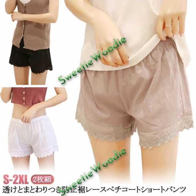 ショート パンツ ペチコート ペチパンツ 綿 インナーパンツ ホワイト 2枚組 ペチコート 膝上 レディース 刺? 大きいサイズ 透け防止 ナチュラル 裾レース付きペチパンツ ルームウエア 白 黒 ブラック レース