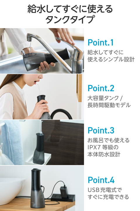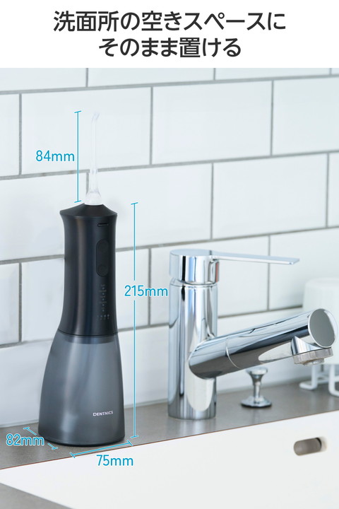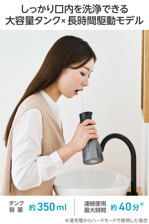水を入れてすぐに使えるシンプル操作。勢いのあるパルスジェット水流で食べカスや汚れを除去し、歯と歯ぐきの健康をサポートするタンク一体型のデンタルウォッシャーです。スタンド形状で自立するため、洗面所で場所を取らずに使えます。