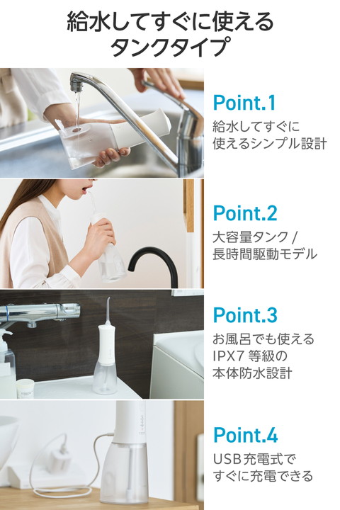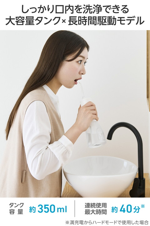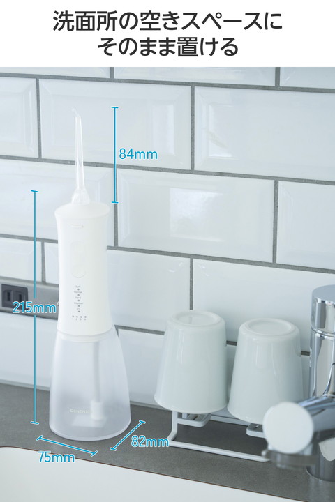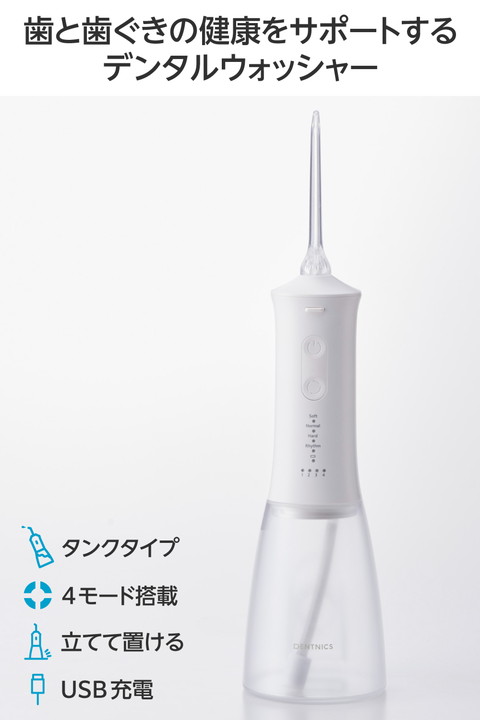 水を入れてすぐに使えるシンプル操作。勢いのあるパルスジェット水流で食べカスや汚れを除去し、歯と歯ぐきの健康をサポートするタンク一体型のデンタルウォッシャーです。スタンド形状で自立するため、洗面所で場所を取らずに使えます。