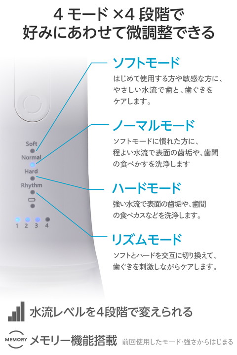 水を入れてすぐに使えるシンプル操作。勢いのあるパルスジェット水流で食べカスや汚れを除去し、歯と歯ぐきの健康をサポートするタンク一体型のデンタルウォッシャーです。スタンド形状で自立するため、洗面所で場所を取らずに使えます。![]() ■勢いのあるパルスジェット水流で食べカスや汚れを除去し、歯と歯ぐきの健康をサポートするデンタルウォッシャーです。 ■水の力で口内の磨き残しを洗浄。最大毎分2000回のパルスジェット水流は、4種類のモードを選んで使えます。勢いやリズムを調整しながら好みに合わせてお手入れ可能です。 ■ハードモード:強い水流で表面の歯垢や歯間の食べカスなどを洗浄します。 ■ノーマルモード:ソフトモードに慣れた方に。程よい水流で、表面の歯垢や歯間の食べカスを洗浄します。 ■ソフトモード:初めて使用する方や歯ぐきの感覚が敏感な方に。やさしい水流で歯と歯ぐきをケアします。 ■リズムモード:ソフトとハードを交互に切り替えて、歯ぐきを刺激しながらケアします。 ■それぞれのモードで、水流レベルを4段階で変えられます。好みに合わせて微調整できるから、より心地よく使えます。 ■※表面に付着している歯垢は、水流だけでは除去できないため、必ず歯磨きが必要です。歯磨きと併用して、本製品で口腔内を洗浄することをおすすめします。 ■一体型のタンク部分に水を入れてすぐに使える、シンプルな設計です。 ■タンク部分がスタンド形状で自立するため、使い終わったらそのまま立てて置くことができます。スペースに限られた洗面所でも、場所を取らずに使えます。 ■前回使用したモードを記録し、起動時にすぐに使えるメモリー機能を搭載しています。 ■水はねを気にせず使える。浴室でも使えるIPX7等級の防水性能です。水深1mに静かに沈め、30分放置しても本体に有害な影響が生じるような水の侵入がない検査をクリアしています。 ■※充電用USB Type-C(TM)ポートおよび付属のケーブルは防水対応ではありません。浴室・加湿器のそばなど水に触れる場所では充電しないでください。 ■1回の満充電で約40分の連続使用が可能。しっかり洗える長時間駆動モデルです。 ※ハードモード使用時 ■USB Type-C - USB-Aケーブルを付属しています。5V/1A出力以上のUSB-Aポート搭載のUSB AC充電器で充電可能です。 ■※本製品にUSB AC充電器は付属していません。 ■水が詰まりにくい機構を搭載した給水ホースを採用しています。 ■交換用のフロスノズル(型番:HC-JF03NZ)・給水ホース(型番:HC-JF03TB)は別途購入も可能。長く安心してお使いいただけます。 ■自社環境認定基準を1つ以上満たし、『THINK ECOLOGY』マークを表示した製品です。 ■廃棄物削減に取り組み、製品に同梱する取扱説明書等をペーパーレス化した製品です。 ![]() ■定格電圧:5V(USB給電入力) ※USB充電器は付属していません。必ず、USB-Aタイプの出力5V/1A以上のUSB充電器をご使用ください。 ■消費電力(最大):3.5W(充電時) ■充電方式:USB Type-C(TM)充電 ■電池種類:リチウムイオン電池 ■電池定格容量:3.7V/1600mAh ■充電時間:約3時間 ※電池を使い切ってから満充電にする場合 ■充電可能回数:約300回 ※充電可能回数は目安です。ご使用環境によっては変動する場合があります。 ■連続使用可能時間:約40分 ※満充電からハードモードで使用した場合 ■重量:約260g ※本体のみ ■タンク容量:約350ml ■カラー:ホワイト ■外形寸法:幅約75mm×奥行約82mm×高さ約215mm(ノズル含まず) ■付属品:フロスノズル×2本、専用USB充電ケーブル×1本(USB Type-C - USB-A) ※取扱説明書は同梱しておりません。エレコムホームページおよびパッケージ中蓋より電子取扱説明書をご確認ください。 ■使用推奨温度:温度5〜40℃ ■防水性能:IPX7 ※充電用USB Type-Cポートおよび付属のケーブルは防水対応ではありません。浴室・加湿器のそばなど水に触れる場所では充電しないでください。 ■保証期間:1年間 |