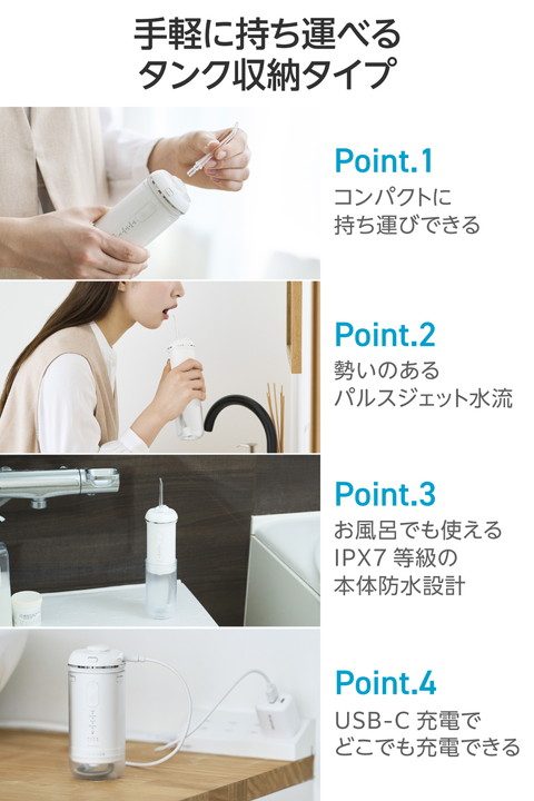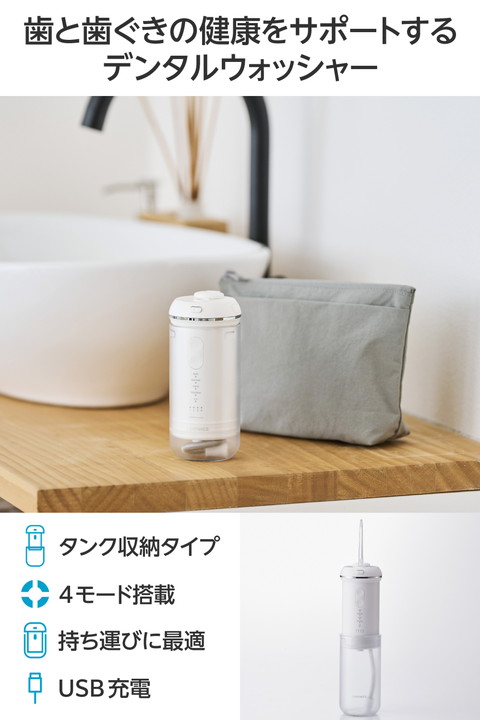ハンディータイプで、どこでもすぐにお手入れ。勢いのあるパルスジェット水流で食べカスや汚れを除去し、歯と歯ぐきの健康をサポートするタンク伸縮式のデンタルウォッシャーです。手軽に持ち運べるコンパクトサイズで、旅行や出張、オフィスでのランチ後のオーラルケアでも活躍します。