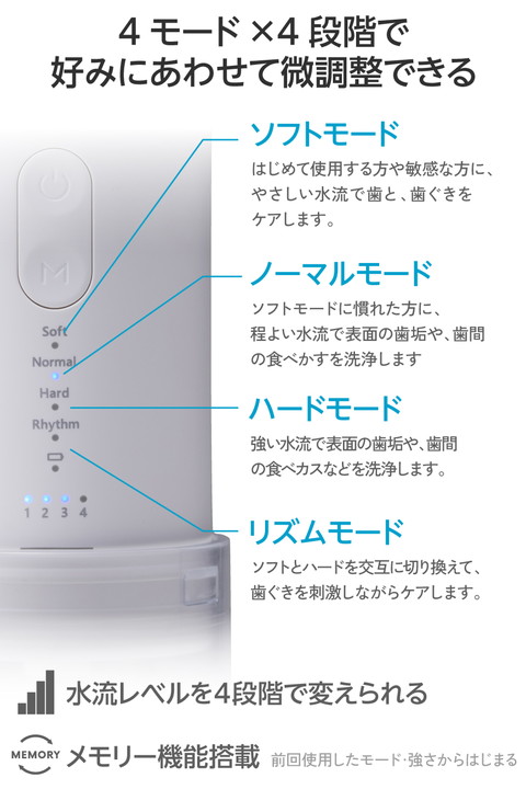 ハンディータイプで、どこでもすぐにお手入れ。勢いのあるパルスジェット水流で食べカスや汚れを除去し、歯と歯ぐきの健康をサポートするタンク伸縮式のデンタルウォッシャーです。手軽に持ち運べるコンパクトサイズで、旅行や出張、オフィスでのランチ後のオーラルケアでも活躍します。![]() ■勢いのあるパルスジェット水流で食べカスや汚れを除去し、歯と歯ぐきの健康をサポートするデンタルウォッシャーです。 ■水の力で口内の磨き残しを洗浄。最大毎分2000回のパルスジェット水流は、4種類のモードを選んで使えます。勢いやリズムを調整しながら好みに合わせてお手入れ可能です。 ■ハードモード:強い水流で表面の歯垢や歯間の食べカスなどを洗浄します。 ■ノーマルモード:ソフトモードに慣れた方に。程よい水流で、表面の歯垢や歯間の食べカスを洗浄します。 ■ソフトモード:初めて使用する方や歯ぐきの感覚が敏感な方に。やさしい水流で歯と歯ぐきをケアします。 ■リズムモード:ソフトとハードを交互に切り替えて、歯ぐきを刺激しながらケアします。 ■それぞれのモードで、水流レベルを4段階で変えられます。好みに合わせて微調整できるから、より心地よく使えます。 ■※表面に付着している歯垢は、水流だけでは除去できないため、必ず歯磨きが必要です。歯磨きと併用して、本製品で口腔内を洗浄することをおすすめします。 ■使用後はコンパクトにたためるタンク伸縮式。ノズルも取り外して本体内部に収納でき、持ち運びに便利です。旅行や出張、オフィスでのランチ後のオーラルケアでも活躍します。 ■前回使用したモードを記録し、起動時にすぐに使えるメモリー機能を搭載しています。 ■水はねを気にせず使える。浴室でも使えるIPX7等級の防水性能です。水深1mに静かに沈め、30分放置しても本体に有害な影響が生じるような水の侵入がない検査をクリアしています。 ■※充電用USB Type-C(TM)ポートおよび付属のケーブルは防水対応ではありません。浴室・加湿器のそばなど水に触れる場所では充電しないでください。 ■1回の満充電で約30分の連続使用が可能。しっかり洗える長時間駆動モデルです。 ※ハードモード使用時 ■USB Type-C - USB-Aケーブルを付属しています。5V/1A出力以上のUSB-Aポート搭載のUSB AC充電器で充電可能です。 ■※本製品にUSB AC充電器は付属していません。 ■水が詰まりにくい機構を搭載した給水ホースを採用しています。 ■交換用のフロスノズル(型番:HC-JF04NZ)・給水ホース(型番:HC-JF03TB)は別途購入も可能。長く安心してお使いいただけます。 ■自社環境認定基準を1つ以上満たし、『THINK ECOLOGY』マークを表示した製品です。 ■廃棄物削減に取り組み、製品に同梱する取扱説明書等をペーパーレス化した製品です。 ![]() ■定格電圧:5V(USB給電入力) ※USB充電器は付属していません。必ず、USB-Aタイプの出力5V/1A以上のUSB充電器をご使用ください。 ■消費電力(最大):3.5W(充電時) ■充電方式:USB Type-C(TM)充電 ■電池種類:リチウムイオン電池 ■電池定格容量:3.7V/1000mAh ■充電時間:約3時間 ※電池を使い切ってから満充電にする場合 ■充電可能回数:約500回 ※充電可能回数は目安です。ご使用環境によっては変動する場合があります。 ■連続使用可能時間:約30分 ※満充電からハードモードで使用した場合 ■重量:約240g ※本体のみ ■タンク容量:約190ml ■カラー:ホワイト ■外形寸法:本体のみ:幅約58mm×奥行約58mm×高さ約196mm(ノズル含まず)、タンク収納時:幅約58mm×奥行約58mm×高さ約133mm(ノズル含まず) ■付属品:フロスノズル×2本、専用USB充電ケーブル×1本(USB Type-C - USB-A) ※取扱説明書は同梱しておりません。エレコムホームページおよびパッケージ中蓋より電子取扱説明書をご確認ください。 ■使用推奨温度:温度5〜40℃ ■防水性能:IPX7 ※充電用USB Type-Cポートおよび付属のケーブルは防水対応ではありません。浴室・加湿器のそばなど水に触れる場所では充電しないでください。 ■保証期間:1年間 |