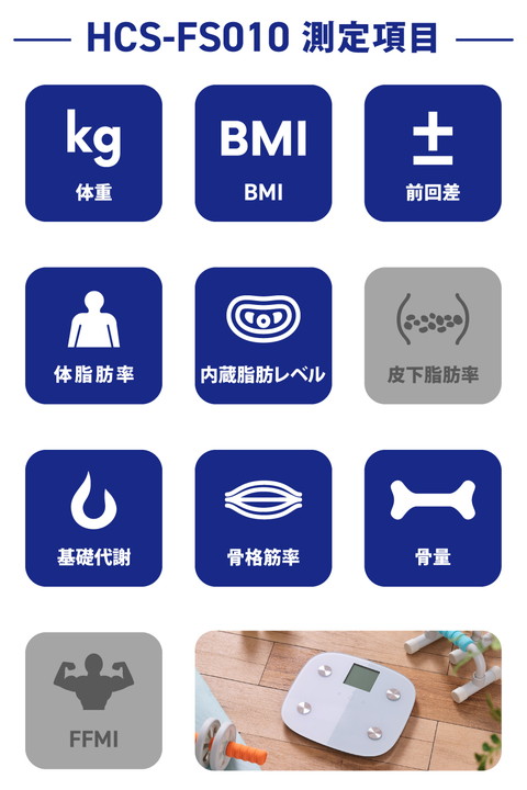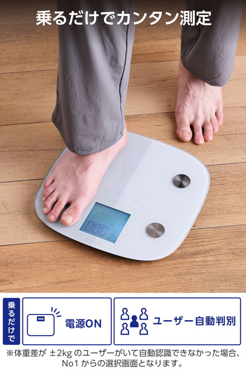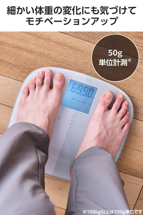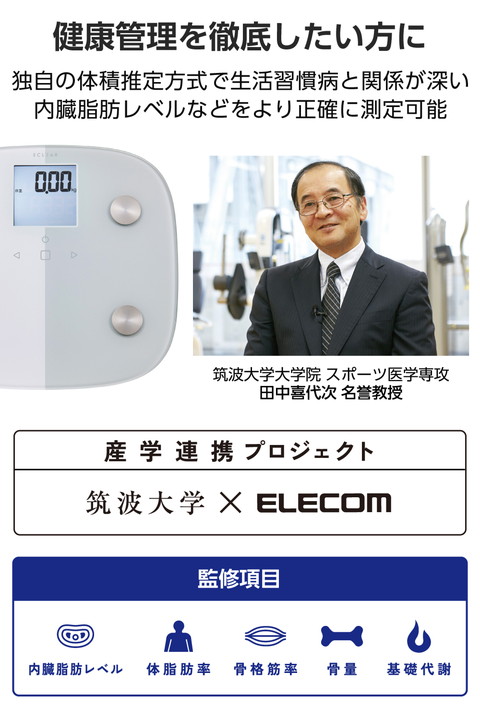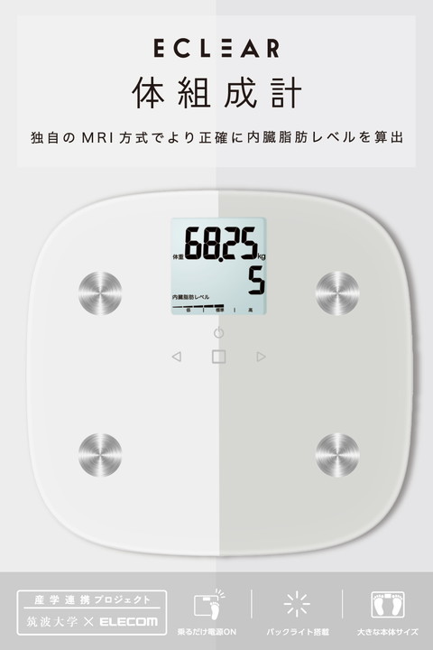 MRI測定データに基づき腹部全体の内臓脂肪を算出する体積推定方式を筑波大学と共同で開発。 より正確に内臓脂肪レベルの評価ができる“ECLEAR体組成計”です。 50グラム単位の精密な測定が可能で、内臓脂肪レベル・基礎代謝など8項目を測定可能。※100kgを超えると100g単位となります。![]() ■MRI測定により腹部全体の内臓脂肪を算出する体積推定方式を採用し、より正確な内臓脂肪レベルの評価が可能な“ECLEAR 体組成計”です。 ■生活習慣病との関係が深い内臓脂肪量の測定は、筑波大学との共同研究により、MRIで胸の下〜腰上までの腹部全体の断層写真を24枚撮影したことによって得られる測定データ(通常、へそまわりのCT画像1枚)を元に、内臓脂肪レベルを30段階でより正確に評価します。筑波大学大学院 スポーツ医学専攻 田中喜代次 名誉教授は、減量・体組成の変化と生活習慣病の関係を研究しており、著書に「エクササイズ科学」等があります。従来はCTで測定されていた内臓脂肪量をMRIで測定、体積をもって計算することで、内臓脂肪レベルの評価の正確性を向上させることを提唱しています。 ■体重・前回差・内臓脂肪レベル・BMI・体脂肪率・骨格筋率・骨量・基礎代謝の8項目が測定可能です。 ■50g単位で測定可能なので、細かい体重の変化にも気づけ、モチベーションの維持ができます。 ■※100kgを超えると100g単位となります。 ■乗るだけで過去の測定データから登録者を推定する自動認識機能を搭載しているため、電源を入れたり、登録した番号を選択したりする必要がありません。 ■足の大きな方でも安心の本体サイズです。 ■暗いところでも数字が見やすいようにバックライトを搭載しています。 ■専用アプリ「ELECOM Healthcare」に測定データを”手入力”することで、過去との比較やグラフ表示などができます。 ■手入力の記録は、カンタン3ステップ。(1)体組成計本体に乗り、体重・体組成を測定 (2)スマホアプリ”ELECOM Healthcare”を開く (3)アプリホーム画面右下の「+」から測定結果を入力 ※事前にアプリに基本情報を入力しておくと、体重・体脂肪率のみを入力するだけでOKです。製品本体とアプリの通信を設定する必要はありません。 ![]() ■最大計量:最大150kg ■測定単位:2.5kg以上〜100kg以下:50g、100kg超え〜:100g ■体重計精度:2.5kg以上〜75kg以下:±100g、75kg超え〜100kg以下:±150g、100kg超え〜150kg以下:±300g ■体重差:-9.9kg〜9.9kg:100g単位 ※前回値のみ ■BMI:0.4〜150.0:0.1単位 ■体脂肪率:5〜75%:0.1%単位 ■体脂肪率判定:9段階 ■骨格筋率:5〜75%:0.1%単位 ■骨格筋率判定:9段階 ■内臓脂肪レベル:レベル1〜30:1単位 ■内臓脂肪レベル判定:6段階(標準:3段階、高:3段階)※内臓脂肪レベルについては「低」の判定がありません。よって、本体パネル上「低」の3段階のLEDは、測定結果によらず常に点灯します。 ■骨量:1kg〜10kg:0.1kg単位 ■基礎代謝量:500kcal〜3000kcal/日:1kcal単位 ■地域:5地域 ■日付:2025年1月1日〜2060年12月31日 ■時刻:0:00〜23:59(24時間表示) ■ユーザー登録数:4人 ■生年月日:1900年1月1日〜2050年12月31日 ■性別:男/女 ■身長:100.0〜250.0cm:0.5cm単位 ■電源:DC4.5V単4形乾電池×3 ■電池寿命:約6カ月※使用環境により異なります。 ■質量:約1.4kg(乾電池を除く) ■サイズ:約幅300×奥行280×高さ25mm ■カラー:ホワイト ■付属品:取扱説明書(本書)×1、お試し用乾電池単4形×3 ■計量法:家庭用特定計量器丸正マーク ■保証期間:1年間 |