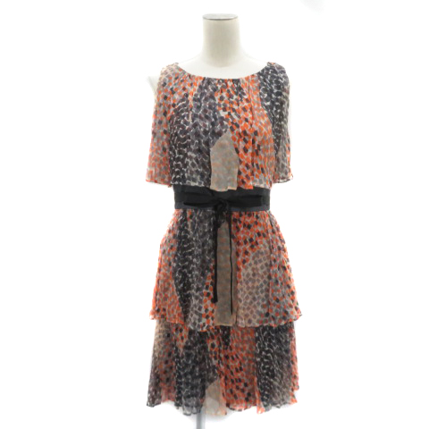 【中古】グレースクラス ノースリーブワンピース ミニ丈 ウエストリボン 総柄 シルク 36 S ダークグレー レディース