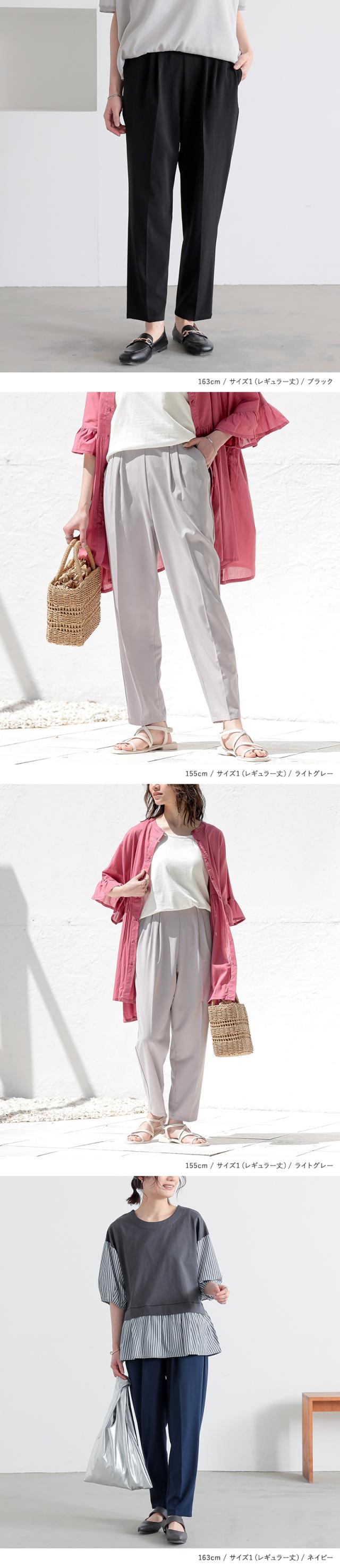 ■デザイン 選べる丈感と気分も上がるカラーバリエーションのテーパードパンツ。身長や好みに合わせて自分サイズが見つかる、ショート丈・レギュラー丈・ロング丈の選べる3タイプ。お尻から太もも周りはゆったり、裾に向かって細くなるオリジナルパターンのテーパードシルエットですっきり見え!ウエストタック入りで気になる体のラインをカバーし、センタープレスが縦ラインを強調して美脚見えも◎ ※センタープレスは永久的な効果ではなく、着用や洗濯で薄れていきます。 ■素材 ポリエステル混のさらりとした肌触りのツイル生地。ややストレッチの効いた素材で、ノンストレスな穿き心地です。洗濯機洗いOK&アイロンで綺麗にシワが取れる生地で、お手入れも簡単。接触冷感素材でひんやり心地良く、暑い季節を中心にロングシーズン活躍するアイテム。 ※接触冷感・イージーケア機能は生地の特性となりますので、着用や洗濯を繰り返しても半永久的に効果が持続します。 ※お洗濯の際は、ネットに入れてお洒落着用洗剤を使い「お洒落着モード」などで洗っていただくと、より長持ちします。 ■ディテール ・両サイド&後ろパッチポケット付き ・ウエストバックゴム仕様ですっきり見え ・便利なベルトループ付き ■コーディネート カジュアルからキレイめまで、スタイルやシーンを選ばず幅広く着用していただけます。 |