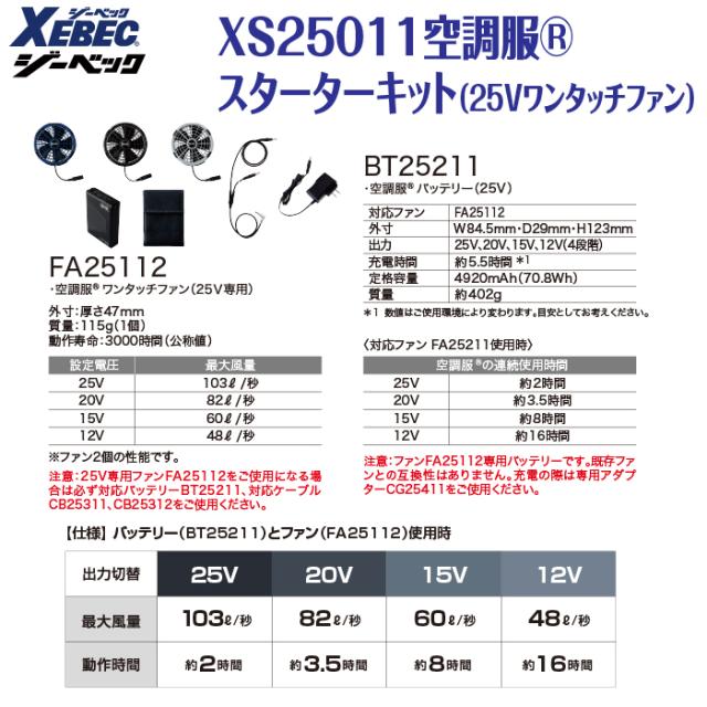 (一部即日発送)空調服 ジーベック XEBEC 作業服 春夏 XS25011 スターターキット(25Vワンタッチファン) F 作業着 バッテリー ファン セット