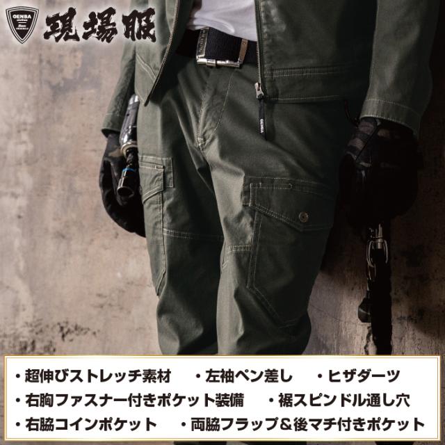 ◇機能:伸縮素材・洗い加工・左袖ペン差し・ストレッチ生地・ヒザダーツで曲げやすい・前中心は丈夫な3YGファスナー・両脇Dカンループ付き・両脇フラップと後マチ付きカーゴポケット・右脇コインポケット・裾内側スピンドル通し穴