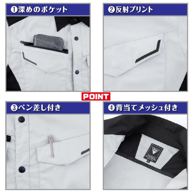 ◇機能:バイオペット・伸縮素材・帯電防止・男女兼用・NEWピタリティ・JIS T8118帯電防止作業服適合商品・ストレッチ生地・左胸ポケットはペン差し付・両胸フラップに反射プリント入り・左袖ペン差し・長財布もスッポリ入る深めのファスナーポケット・通気性の良い背当てメッシュ付き