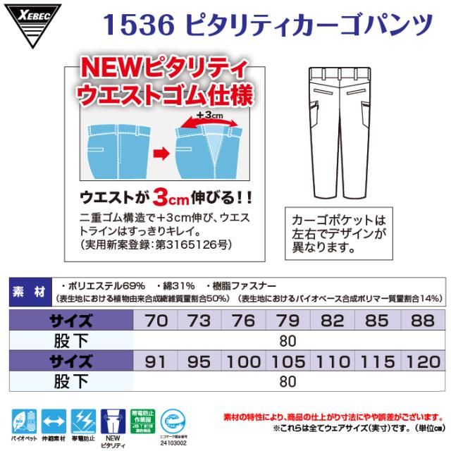 ジーベック XEBEC 作業服 春夏 1536 ピタリティカーゴパンツ 70-100 作業ズボン 作業着