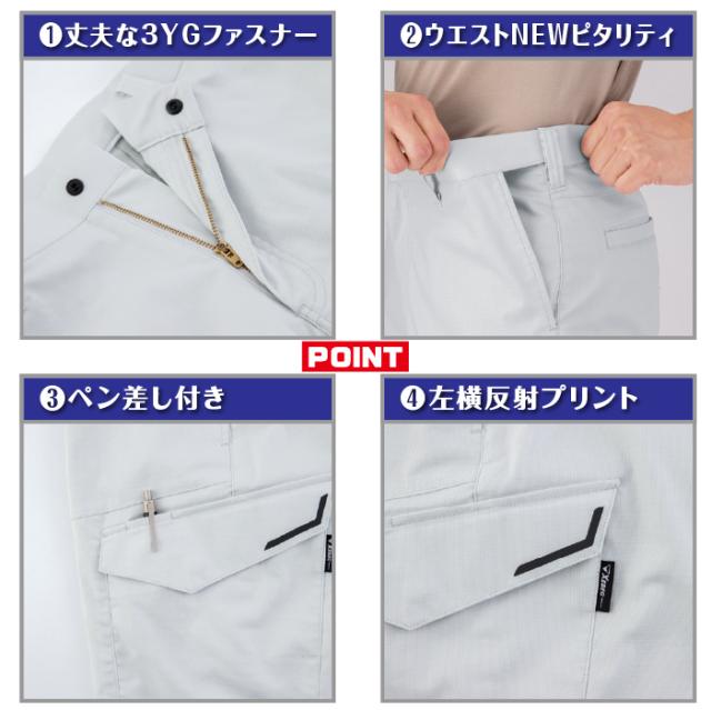 ◇機能:バイオペット・伸縮素材・帯電防止・男女兼用・NEWピタリティ・JIS T8118帯電防止作業服適合商品・ストレッチ生地・前中心は丈夫な3YGファスナー・ウエストNEWピタリティ仕様・右脇横ポケットはファスナー仕様・左脇横ポケットはペン差し付き・左脇横フラップに反射プリント入り