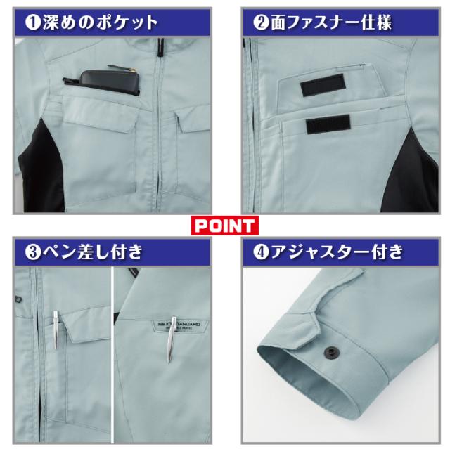 ◇機能:バイオペット・伸縮素材・帯電防止・男女兼用・NEWピタリティ・JIS T8118帯電防止作業服適合商品・のびのびストレッチ・左胸ポケット脇ペン差し付・左袖ペン差し・長財布もスッポリ入る深めのファスナーポケット・胸フラップポケットは面ファスナー仕様・裾 袖口は2段階に調節できるアジャスター付・左右内ポケット