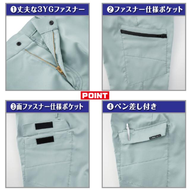 ◇機能:バイオペット・伸縮素材・帯電防止・NEWピタリティ・JIS T8118帯電防止作業服適合商品・ストレッチ生地・前中心は丈夫な3YGファスナー・ウエストNEWピタリティ仕様・左横フラップポケットは面ファスナー仕様・左脇横ポケットはペン差し付き・右脇横ポケットはファスナー仕様でモノが落ちにくい