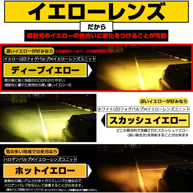 イエローレンズにLEDイエロー光を通すのでフォグの照射光は「濃いイエロー光=DEEP YELLOW」になります。イエローレンズなので非点灯時も抜群のアピール性を発揮します。