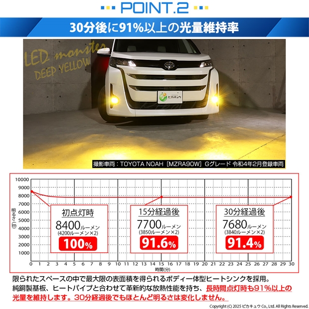 明るさ全光束8400ルーメンの最強のモンスターフォグランプLEDバルブです。放熱性能が高いため、長時間点灯後も91%以上の光量を維持します。30分経過後もほとんど明るさが変化しない放熱対策を施しています。純正球の配光特性に徹底的にこだわり、理想的な配光を実現しています。