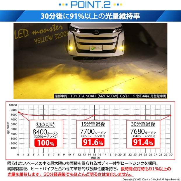 明るさ全光束8400ルーメンの最強のモンスターフォグランプLEDバルブです。放熱性能が高いため、長時間点灯後も91%以上の光量を維持します。30分経過後もほとんど明るさが変化しない放熱対策を施しています。純正球の配光特性に徹底的にこだわり、理想的な配光を実現しています。