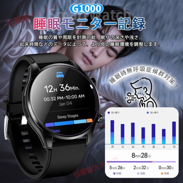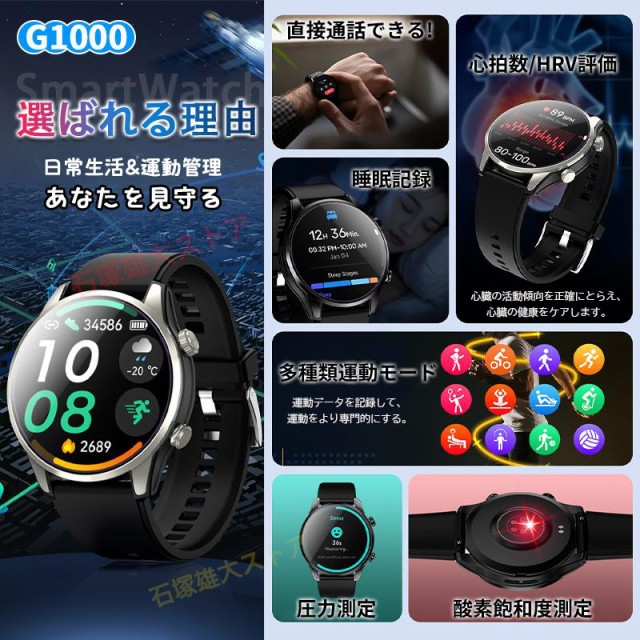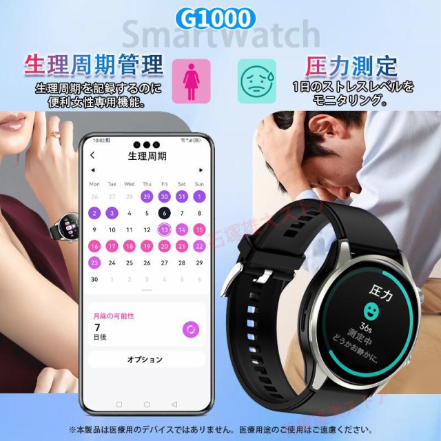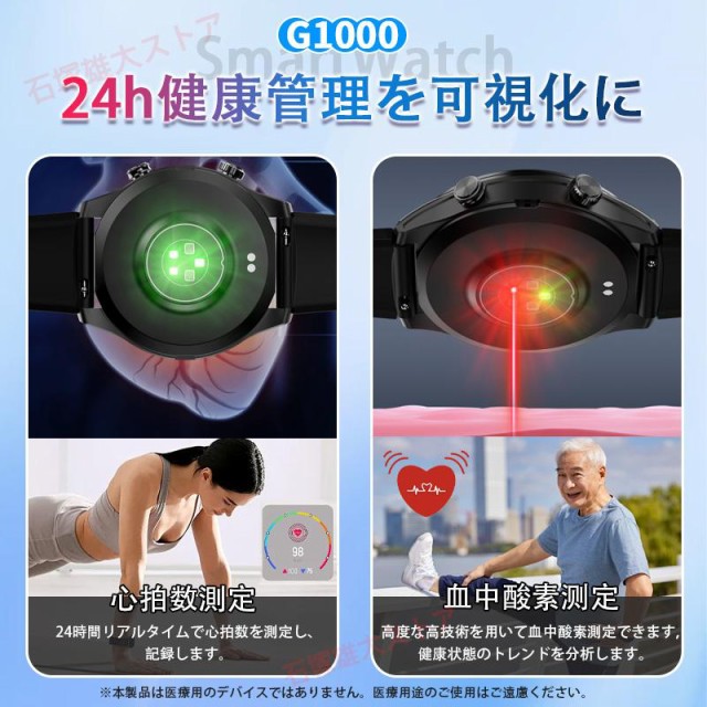 ●24H健康管理:多機能測定、血中酸素、通話可能、カロリー、24時間体温監視、アラート、AI診断測定、睡眠監視や心拍数などの測定機能付き