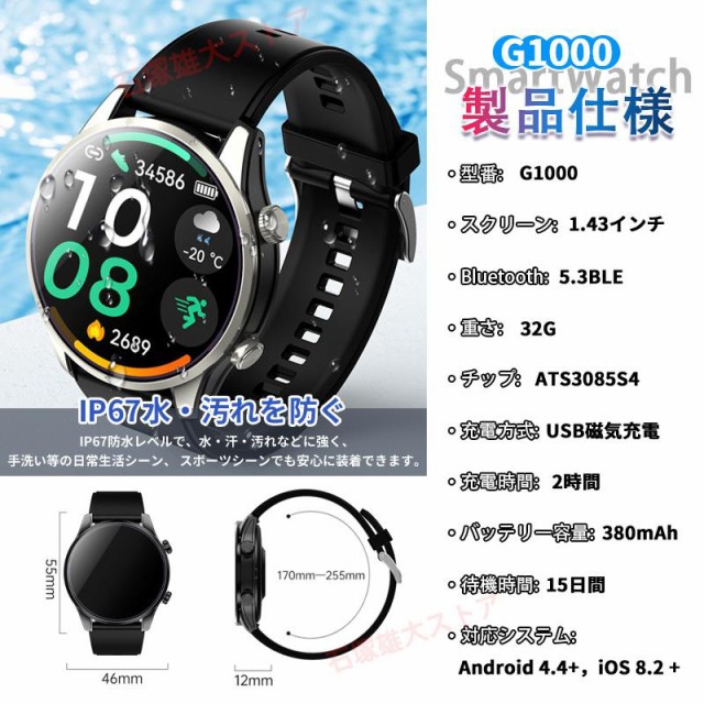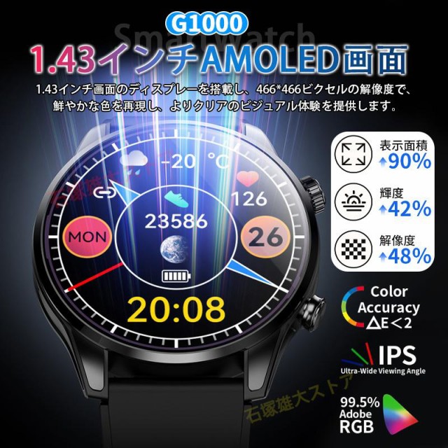 このスマートウォッチは業界初の1.43インチ大画面のタッチパネルを採用し、老眼の方にも見やすい!画質がより鮮明になり、高精度な大画面で通知や文字が一目瞭然に表示される。上下左右のスライド操作で機能の切替も簡単です。本体で5つの表盤画面搭載する以外、専用アプリで50+種類の文字盤を自由に設定することができます。他に、家族、恋人、アイドル、及びペット等の好きな写真も文字盤に設定可能で毎日新鮮さを味わえる。
