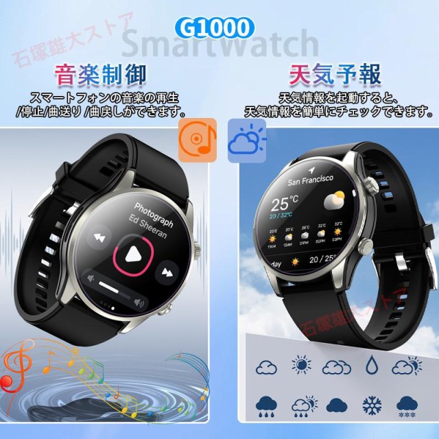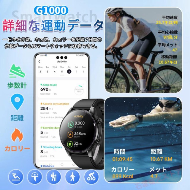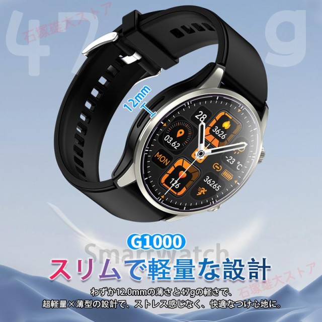 スマートウォッチには多機能測定、血中酸素、心拍数、睡眠、音楽制御、電卓、メッセージ通知、天気予報、カメラ制御、アラーム、懐中電灯、腕上げ点灯、スマホ探し、ストップウォッチなど充実の機能を搭載して、日常生活をより便利にします。オフィス仕事や在宅勤務など必要な座りがち注意、水飲み通知機能付きます。