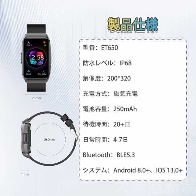 【豊かな機能・250+文字盤自由設定】 専用APP「HBand」と同期させるとスマートウォッチは音楽制御、メッセージ通知、天気予報、カメラ制御、アラーム、腕上げ点灯、スマホ探し、ストップウォッチなど充実の機能が利用でき、日常生活をより便利にします。オフィス仕事や在宅勤務など必要な座りがち注意、水飲み通知機能付きます。さらに、アプリは250種類以上の文字盤が搭載され、ビジネス、通学や日常生活など、どんなシーンでも使用できます。アプリで自分の好きな写真を文字盤としてカスタマイズできます。IOS11.4/ Android6.0以上対応のスマートフォンに適応できる スマートウォッチ 。