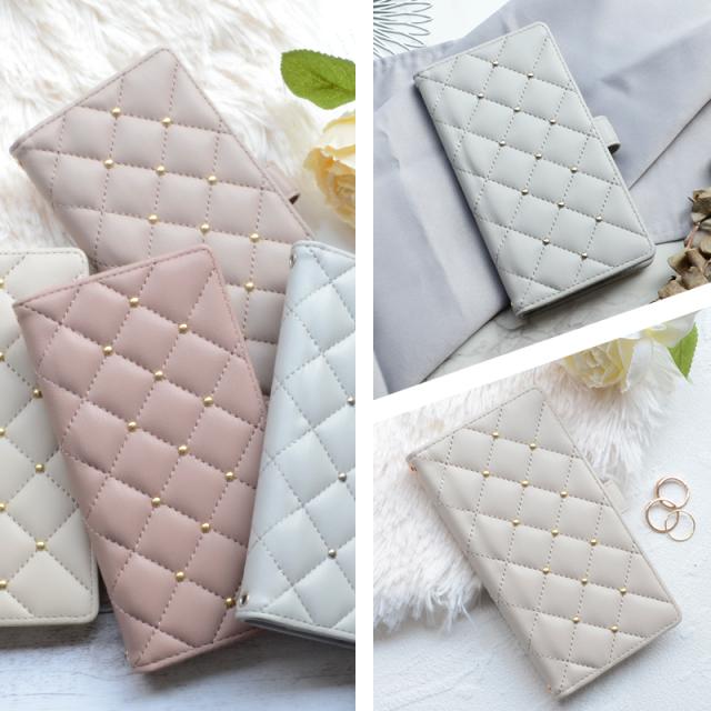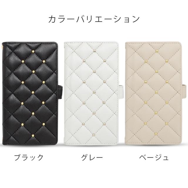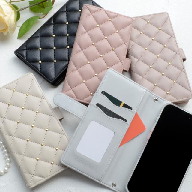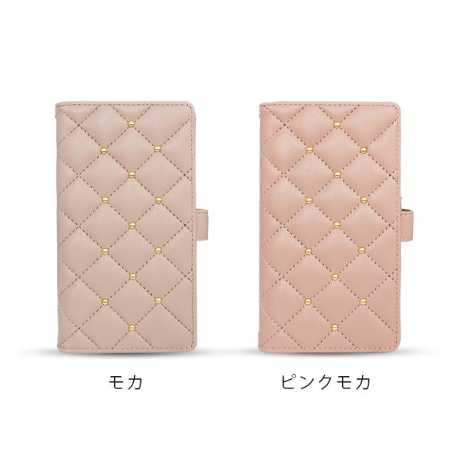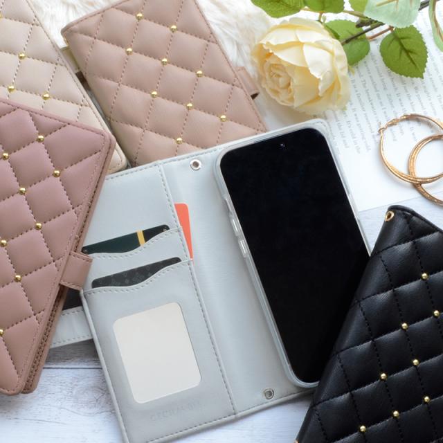 触り心地の良いふわふわとした質感のキルティング素材を使用したおしゃれなケースで、かわいいスタッズがアクセントになっています。
