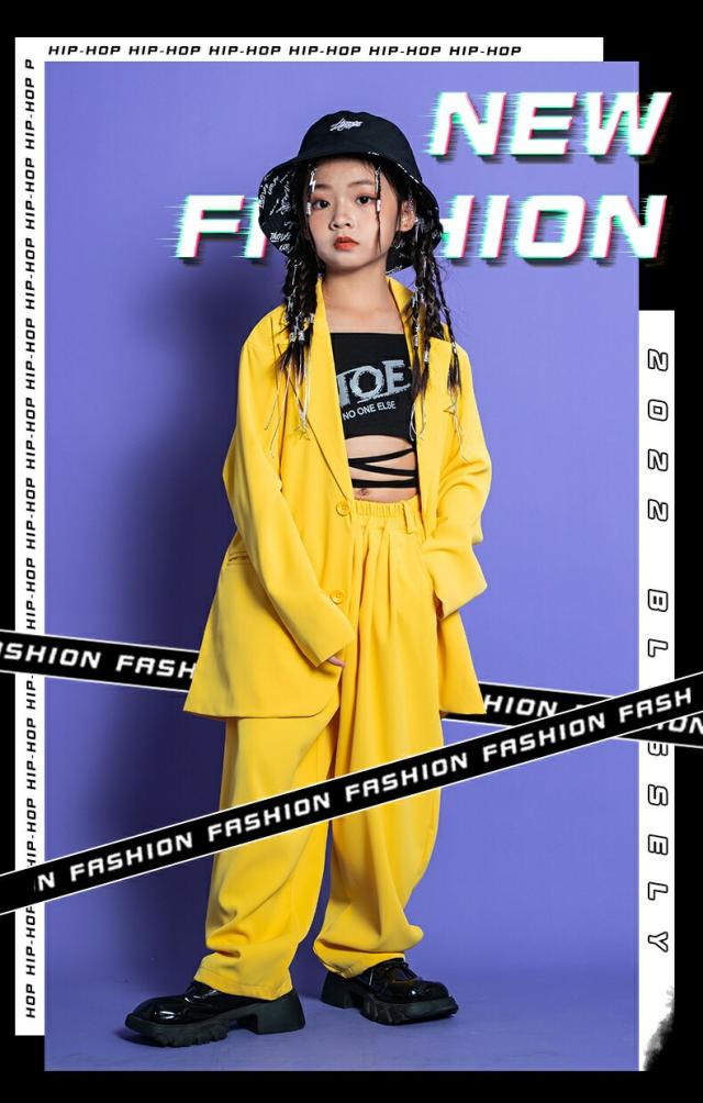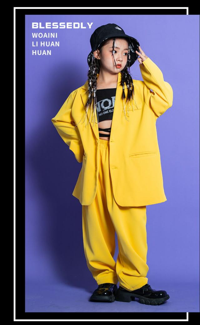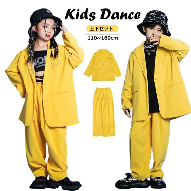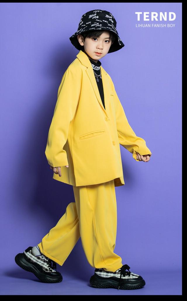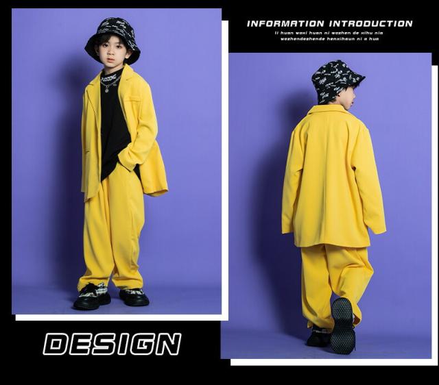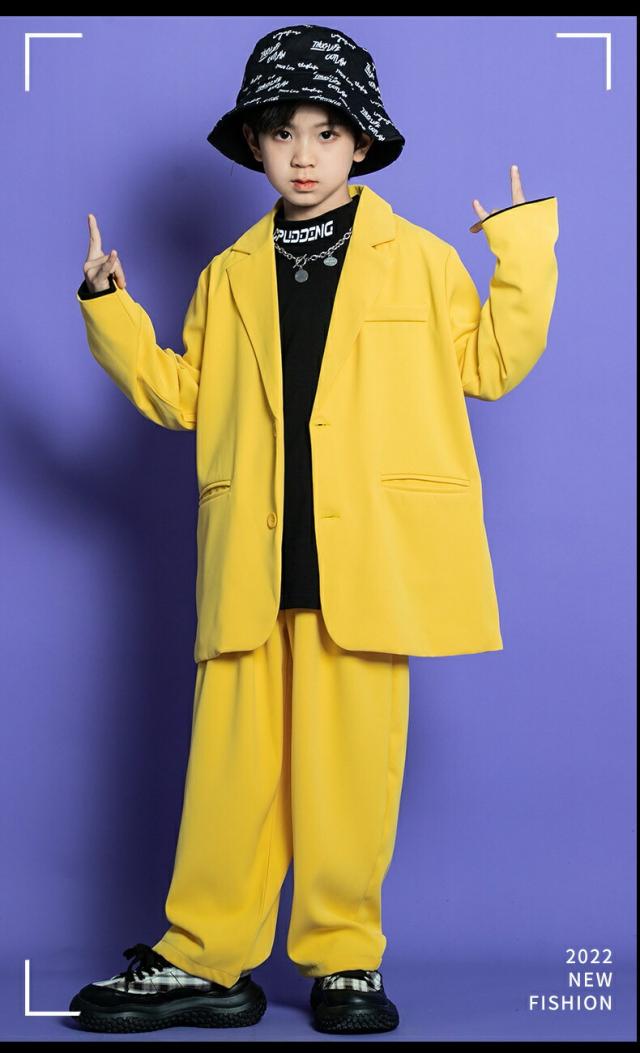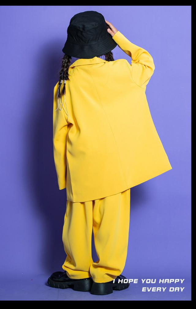 イエロー スーツ セットアップ キッズ ダンス衣装 ヒップホップ ジャケット ジャズ 長袖 トップス ユニセックス 子供服 韓国 ステージ衣装 演出服 おしゃれ 大きいサイズ hiph 発表会