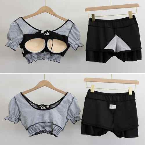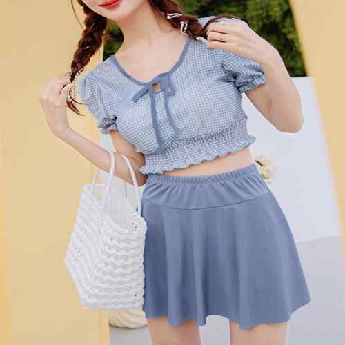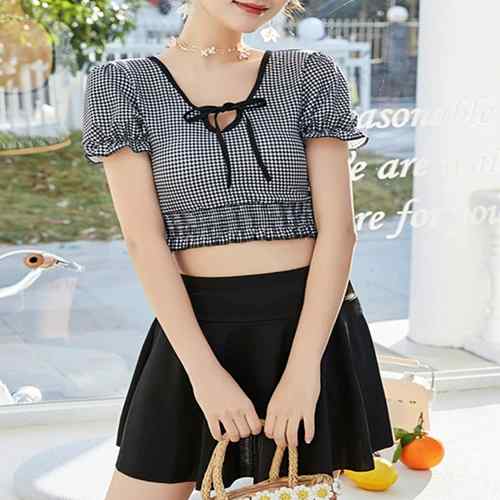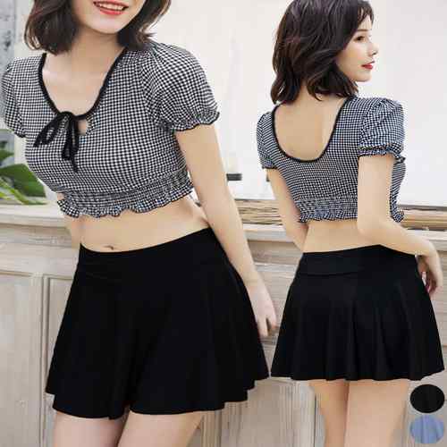 ガーリーで可愛らしいクロップド丈のチェック柄トップスとシンプルなフレアスカートの2点セットの水着