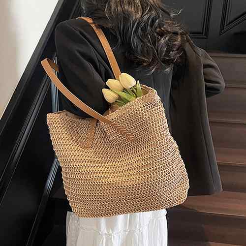 シンプルなデザインながら、編み目の美しさとフェイクレザーのストラップがアクセントに。