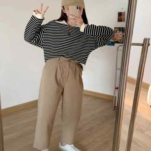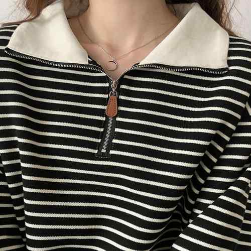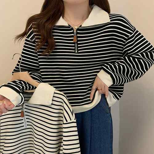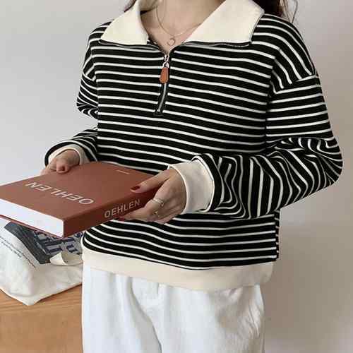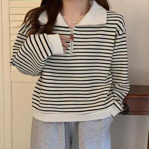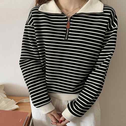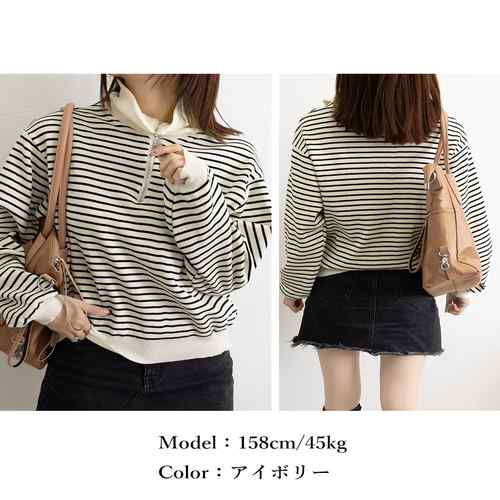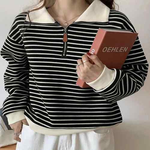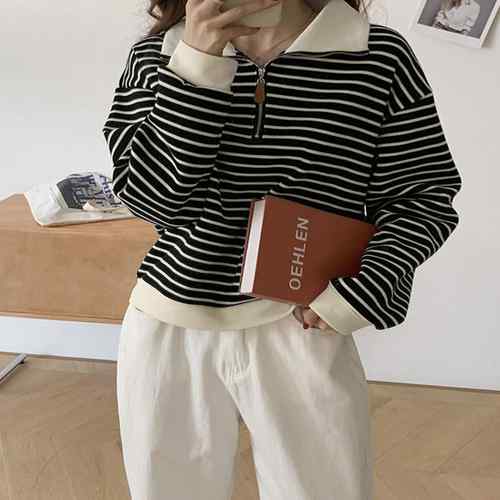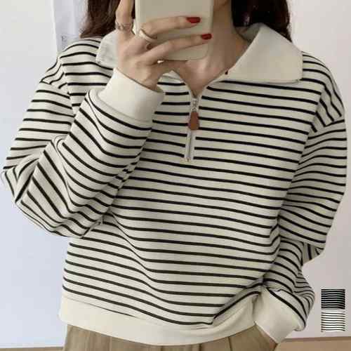 シンプルでありながら洗練された雰囲気を持つボーダー柄ポロカラーニットトレーナーが新登場