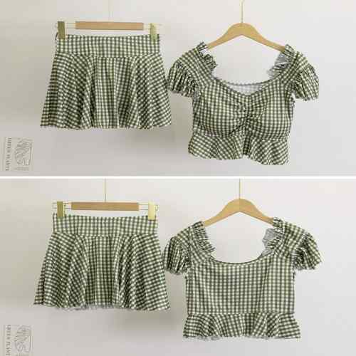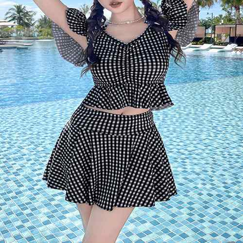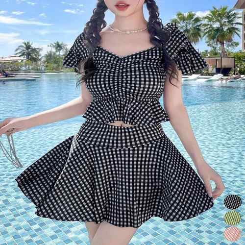 フリルトップス ハイウエストスカート 体型カバー水着セット 大人可愛い チェック柄セパレート水着 露出控えめ水着ガーリー 海水浴ビーチウェア リゾート水着着やせ 韓国風スイムウェア