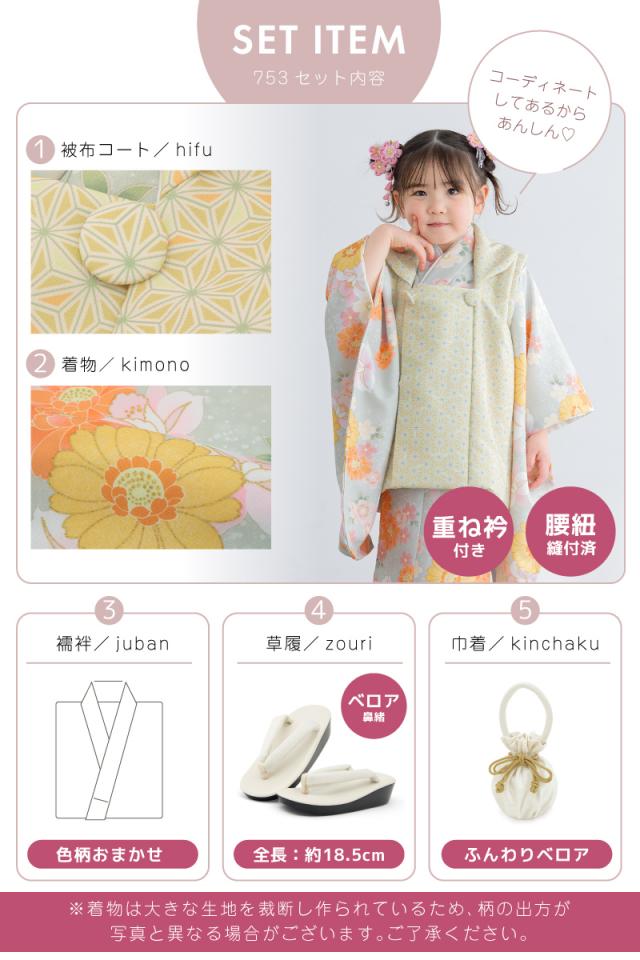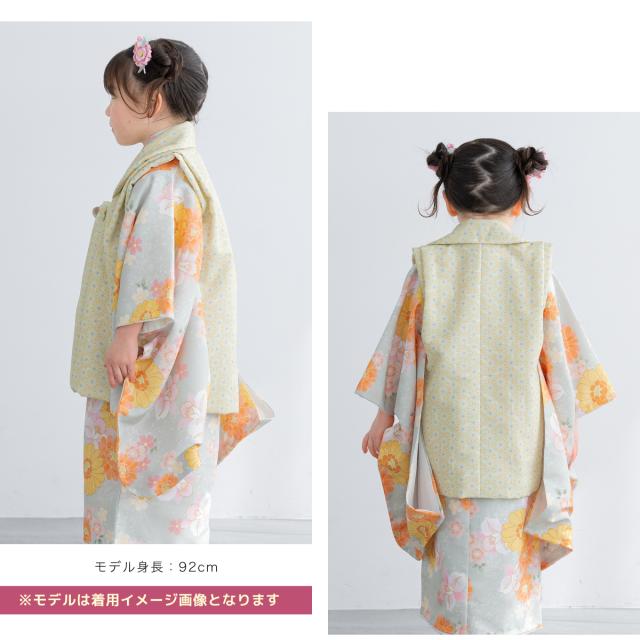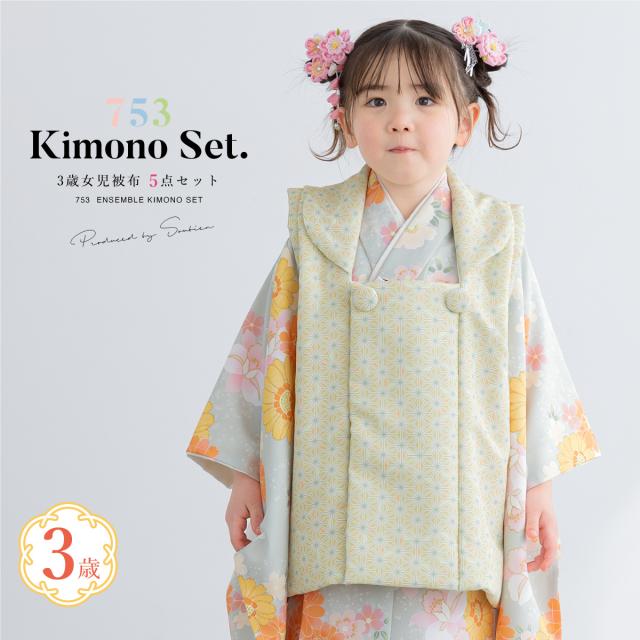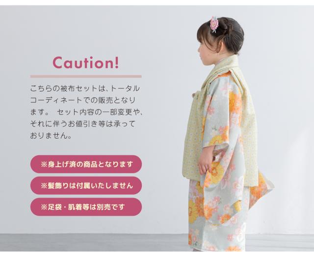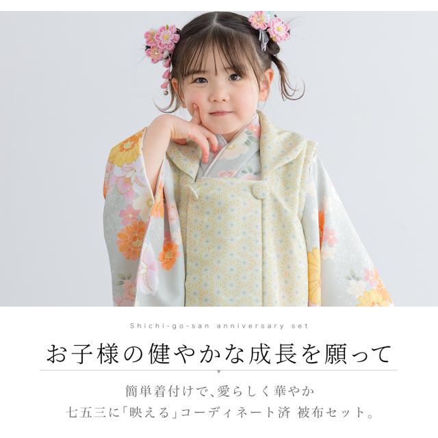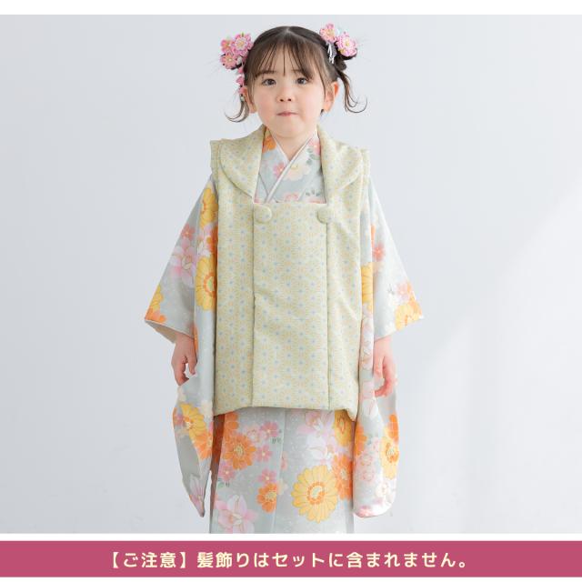 被布着物セット 七五三 三歳 女の子 着物 被布 販売 被布コート 襦袢 草履 セット 緑 黄緑 麻の葉 ガーベラ 花柄 レトロ モダン コーディネート済み 可愛い 753 女児 送料無料