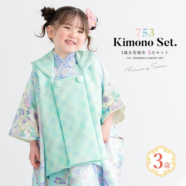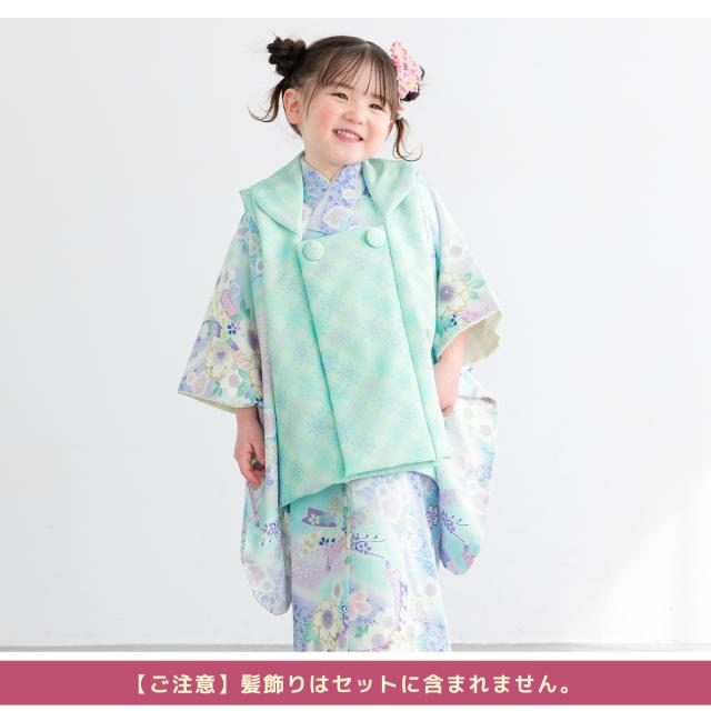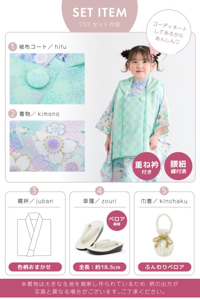 被布着物セット 七五三 三歳 女の子 着物 被布 販売 被布コート 襦袢 草履 セット 水色 唐花 束ね熨斗 桜 花柄 レトロ モダン コーディネート済み 可愛い 753 女児 送料無料