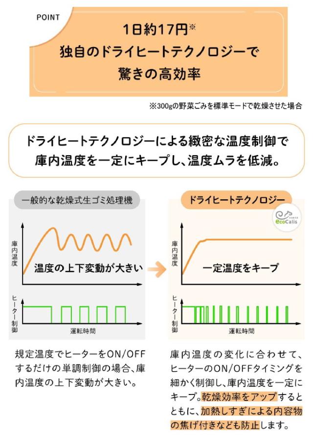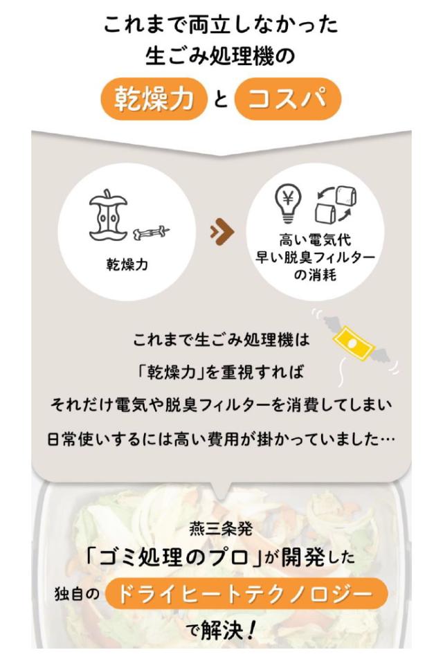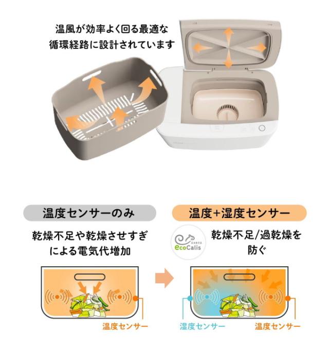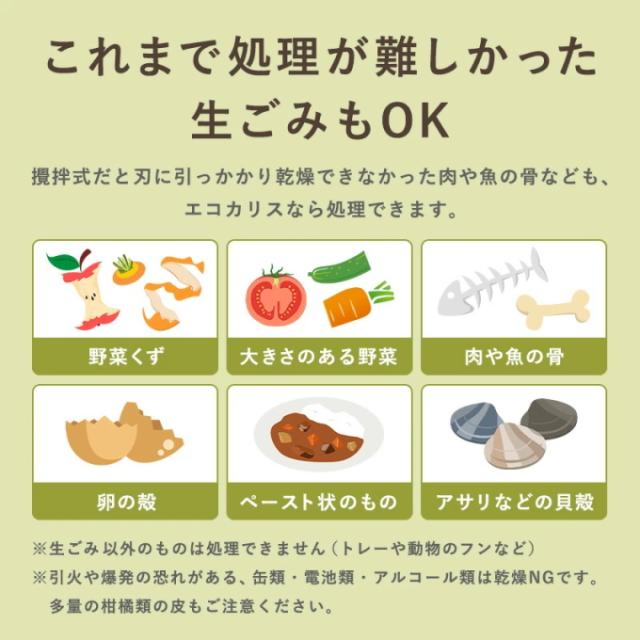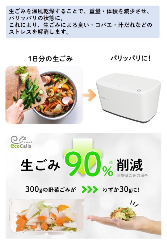| 特徴 | 乾燥力と運用コストの両立を実現した温風乾燥式生ゴミ処理機。 圧倒的乾燥力で生ごみをパリッパリの状態に。 生ごみによる臭い・コバエ・汁だれなどのストレスを解消します。 300gの野菜ゴミが片手に収まる程少ない30gに! 生ごみの約90%削減します。(野菜ごみの場合) SANKA独自のドライヒートテクノロジーで高い乾燥力を効率的に実現。 電気代は1回当たりわずか17円! ※300gの野菜ごみを標準モードで乾燥させた場合。 乾燥させた生ごみは土と混ぜて熟成させることで有機肥料として再利用できます! エコカリスは自治体の生ごみ処理機設置費用助成の対象商品です。 ※助成制度の詳細については、お住まいの自治体にお問い合わせください。 ■専用脱臭フィルター 2個セットはこちら↓ 脱臭フィルター 2個セット |