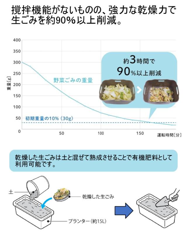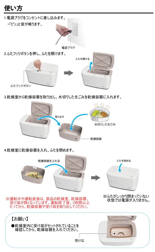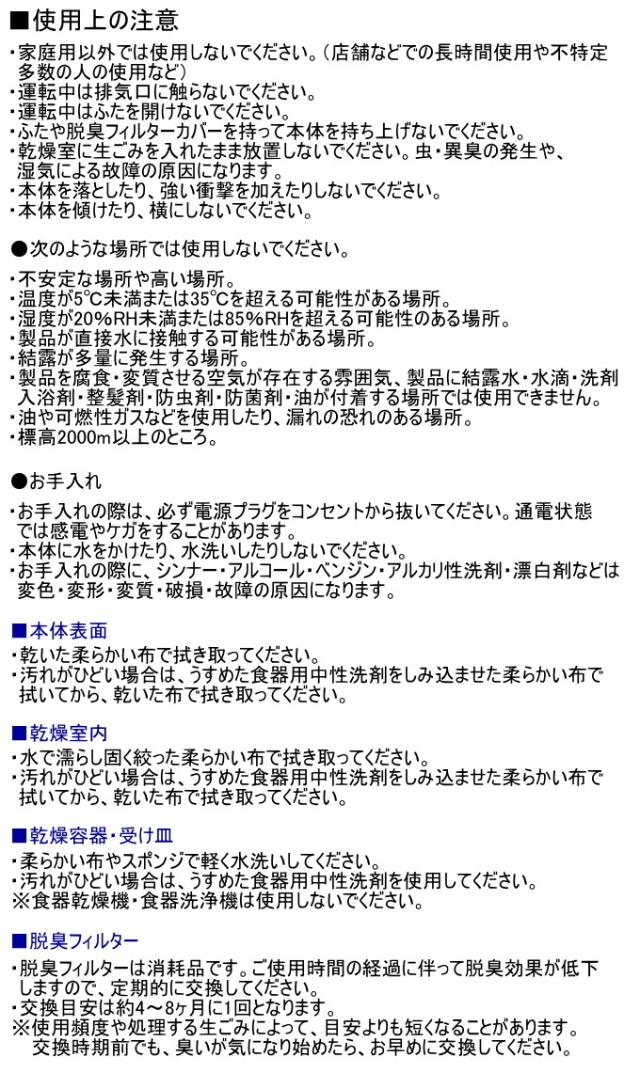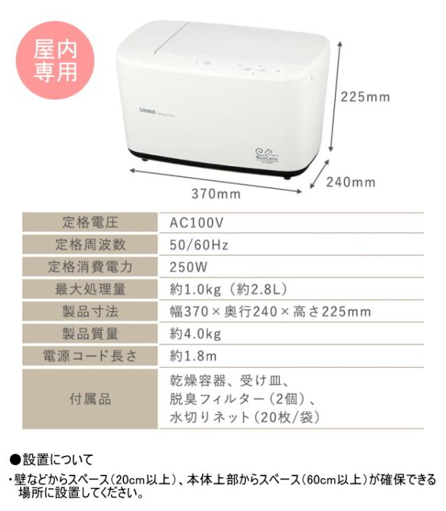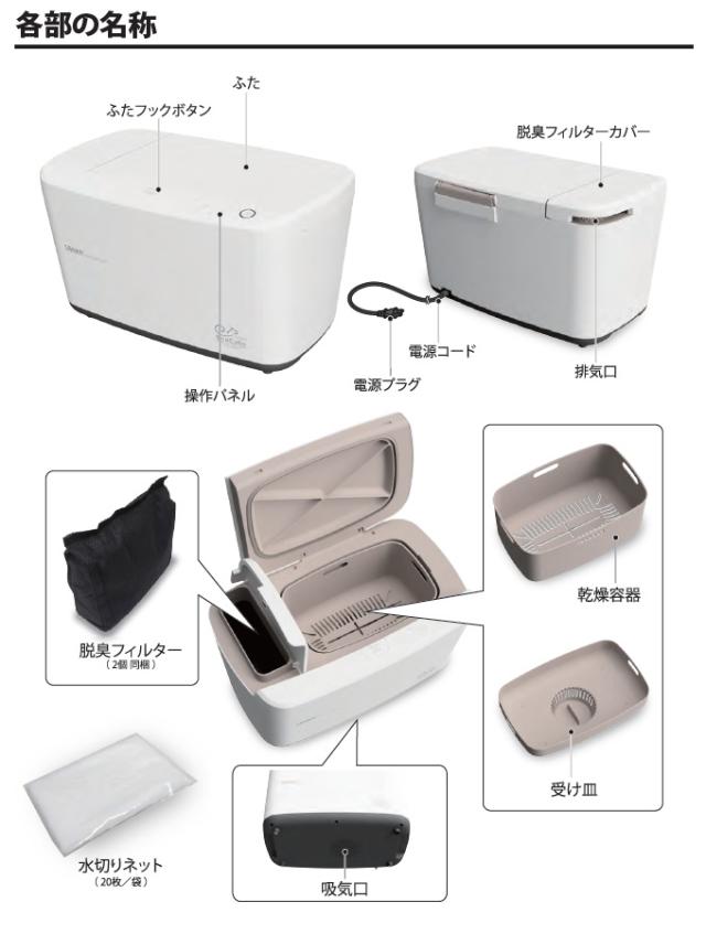 | 付属品 | 乾燥容器、受け皿 脱臭フィルター(2個) 水切りネット(20枚/袋) |