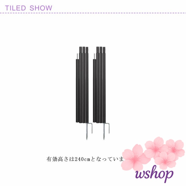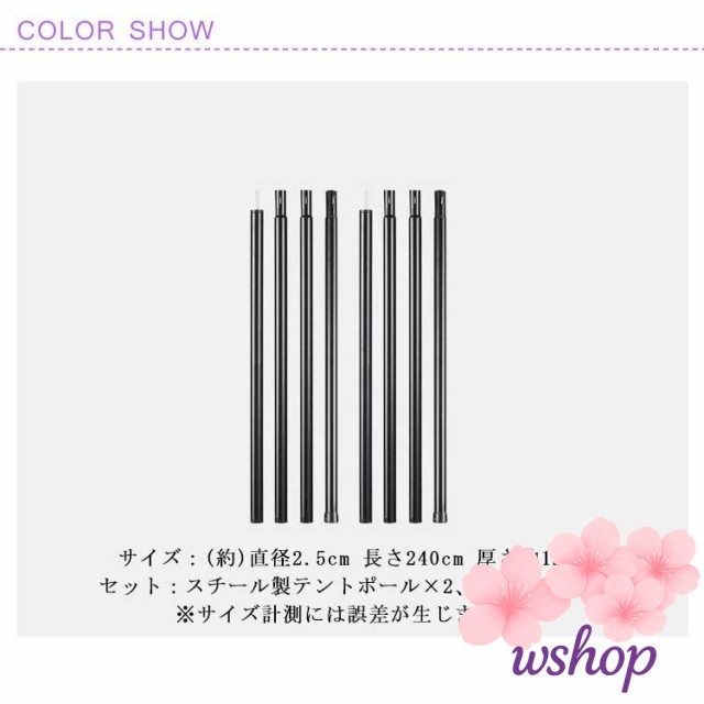 | サイズについての説明 | サイズ:(約)直径2.5cm 長さ240cm 厚さ約1mm セット:スチール製テントポール×2、収納袋×1。 ※サイズ計測には誤差が生じます。 |