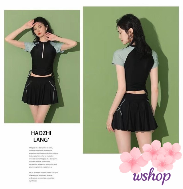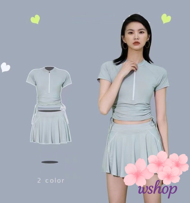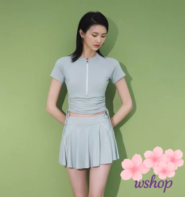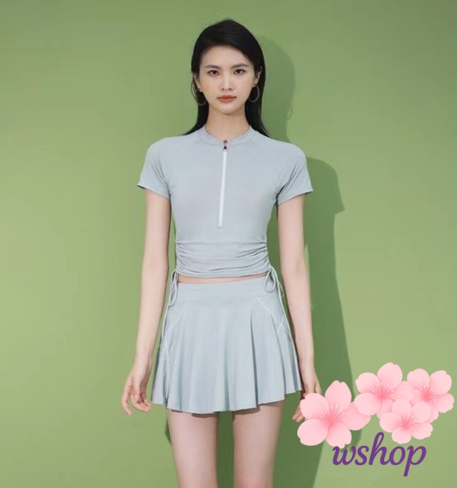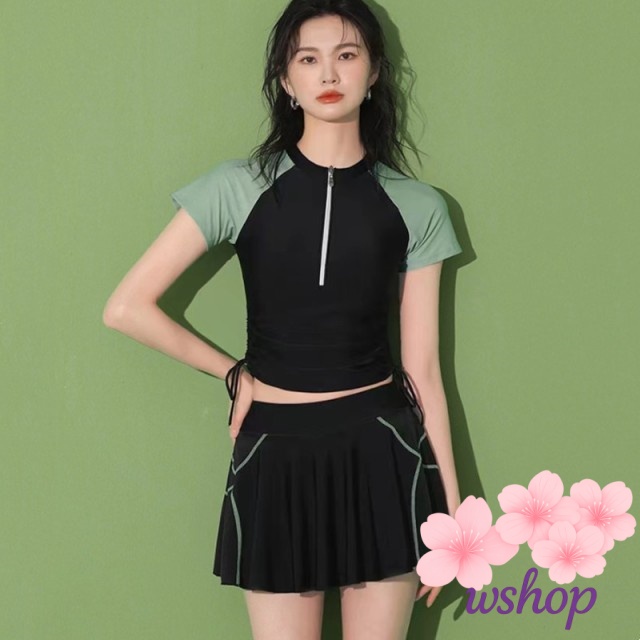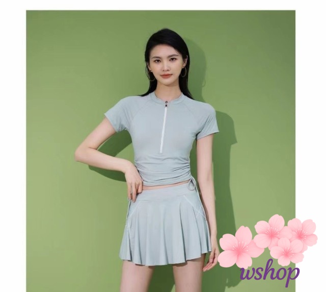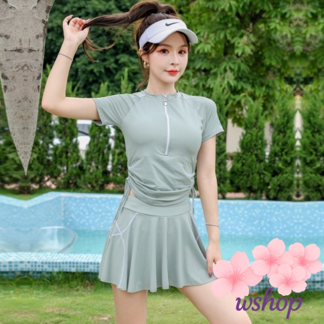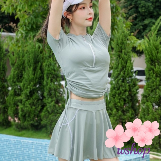 【wshop】2点セット 水着 レディース セパレート 前開き 半袖Tシャツ パッド付き スカート ショートパンツ 中学生 高校生 体型カバー おしゃれ