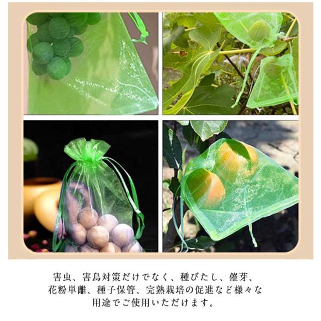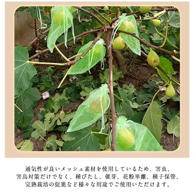 | 虫や鳥から丹精込めて育てた果物を守る防虫、防鳥ネットです。栽培するものによって必要になるサイズが異なることから、大きさが違う2種類のネットをご用意いたしました。 内容枚数は100枚と大容量のため、枚数を必要とする農家さんにおすすめです。使い回しも効き、たくさんの果物をカバーできるので安心です。 巾着袋のように予め袋口に口を縛る紐が付いているため、袋にかぶせたいものを入れ、口を閉めるだけです。開閉にも非常に便利です。袋に入れたまま果実を保存できる。ブドウ、リンゴ、イチゴ、イチジク、植物、野菜、花を保護し、植物を健康に保ちます。 高品質ナイロンで、大切な果物や野菜をしっかりガードします。耐腐食性に優れ、無袋で栽培した果実よりも老化、日焼け防止に効果があることから痛みが少ない状態で収穫することができます。通気性は抜群なので果物を傷める心配もありません。 通気性が良いメッシュ素材を使用しているため、害虫、害鳥対策だけでなく、種びたし、催芽、花粉単離、種子保管、完熟栽培の促進など様々な用途でご使用いただけます。 害虫、害鳥対策だけでなく、種びたし、催芽、花粉単離、種子保管、完熟栽培の促進など様々な用途でご使用いただけます。 | |
