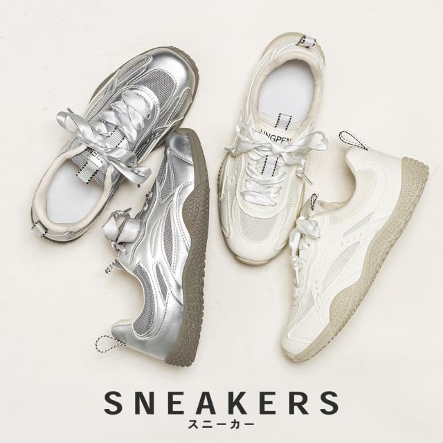 リボンスニーカー ローカットスニーカー レディース ガーリー 太めシューレース かわいい おしゃれ シンプル カジュアル スポーティー ホワイト シルバー トレンド 靴 革靴 合成皮革 合成繊維 合成ソール 軽量 歩きやすい 通学 通勤 普段使い 春 夏 秋 冬 22.5cm 23.0cm 23.5cm 24.0cm 24.5cm 25.0cm 中国製 プレゼント ギフト お出かけ