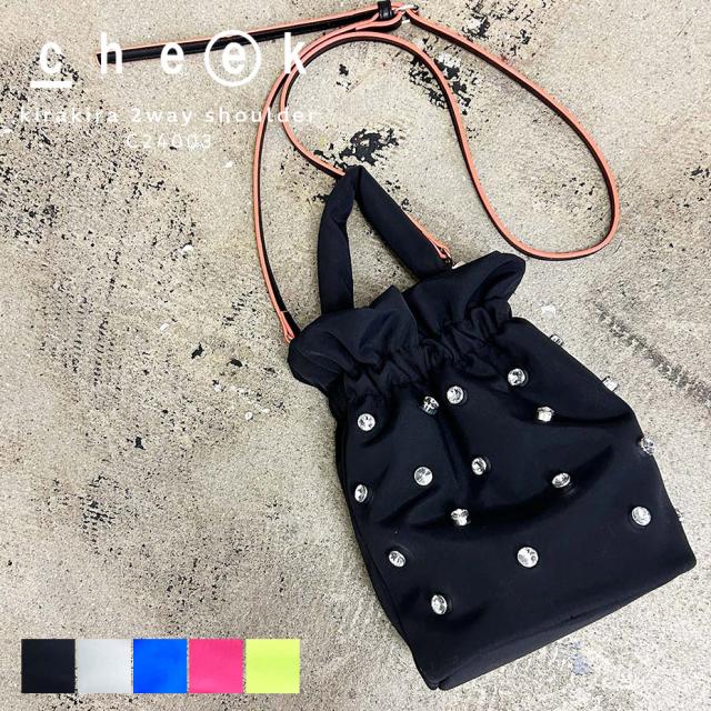cheek チーク kirakira 2way shoulder 巾着バッグ ショルダーバッグ ミニバッグ 2WAY キラキラ スタッズ クッション風 ふわふわ ハンドル ゴム口金 スマホストラップ カラフル 裏地コントラスト 内ポケット付き 軽量 GRSリサイクル素材 エコ素材 ポリエステル レディース プレゼント ギフト ブラック ブルー グレー ピンク イエロー