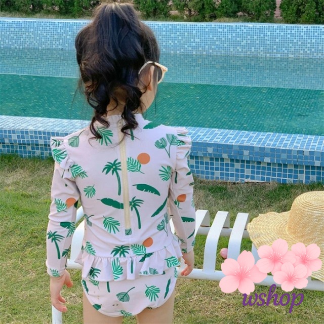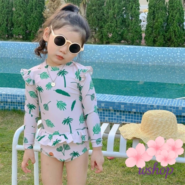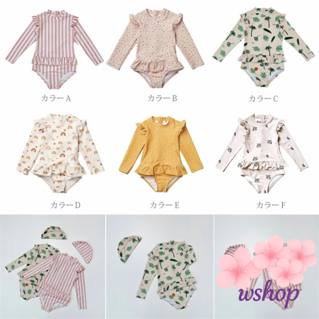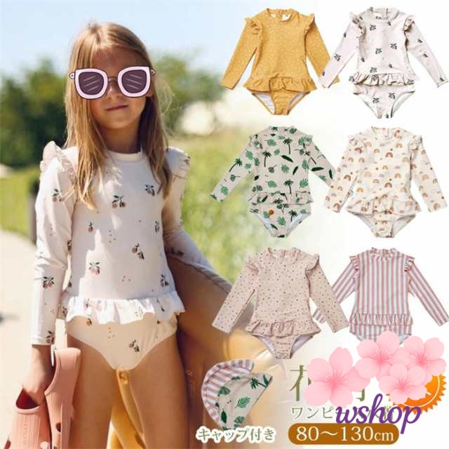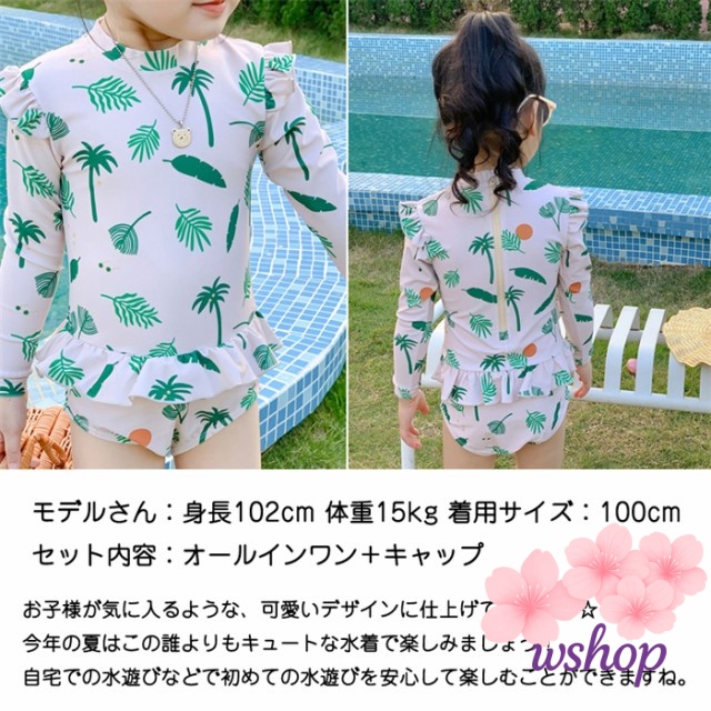 【wshop】【品質保証】ラッシュガード キッズ 女の子 水着 花柄ワンピース 子供着 ベビー水着 オールインワン水着 長袖ラッシュガード キッズ 子供水着 女の子 こども みずぎ 子供用 女児 日焼け防止 プール フリル フラワーワンピ水着 小学生 スイムキャップ 80 90 100 110 1