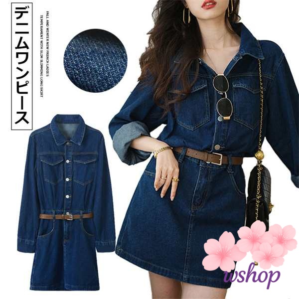 【wshop】デニムワンピース 体型カバー 膝丈 長袖 ワンピース デニム aライン 大きサイズあり 春夏 20代 30代 40代 50代 ゆったり きれいめ送料無料