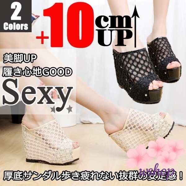 【wshop】10cmUP レースミュール 夏サンダル レディース シューズ 厚底サンダル 美脚 オフィスサンダル ハイヒール 女性サボサンダル スリッポン ミュール ウェッジソール 厚底サンダル レディース ミュール ウェッジソール ハイヒール