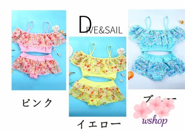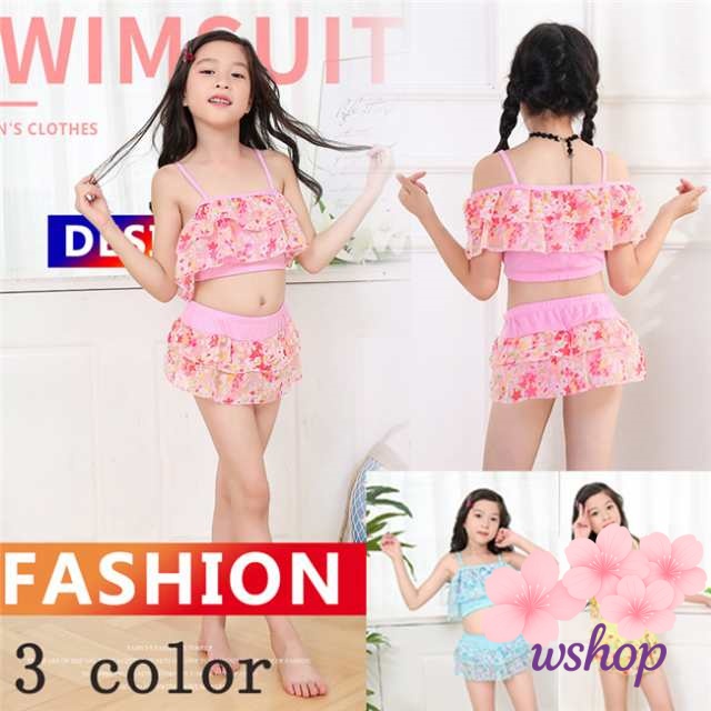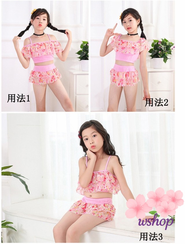 【wshop】キッズ水着 女の子 ビキニ 3ways 2点セット 子供用 こども 女児 スイムウェア ガールズ ビキニセット 105-160cm 水泳服 水遊び 花柄