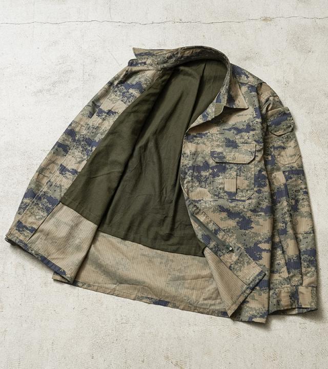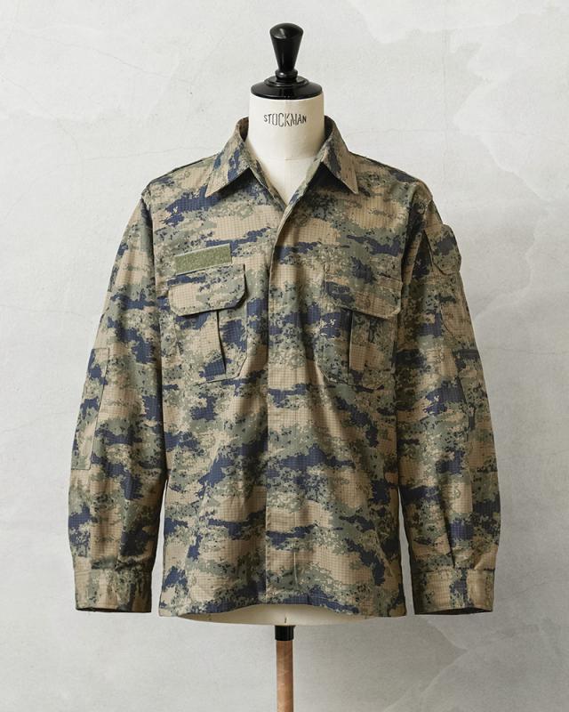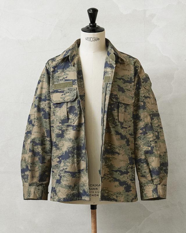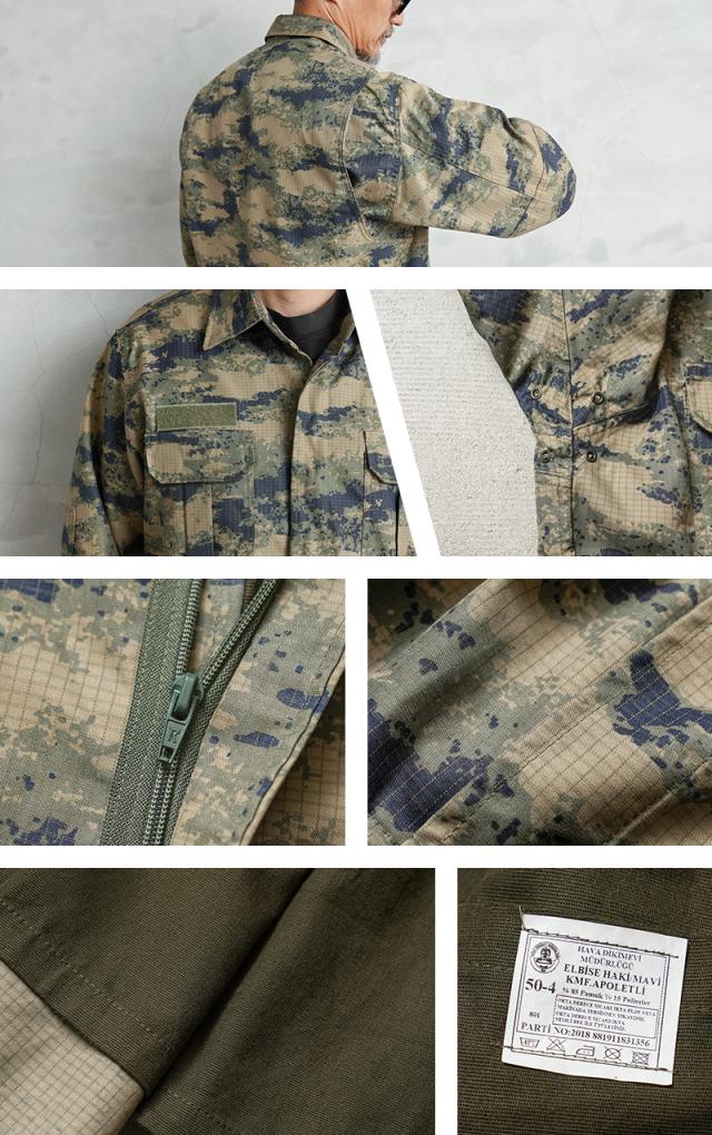 トルコ軍からNANOカモフラージュという迷彩を使用したジャケットが入荷しました!2008年頃から2019年頃まで採用されていた迷彩柄で、青みがかったブラックに見える部分がトルコ空軍のNANOカモの特徴です。格子状に織り込まれた生地で耐久性が高められ、軽量ながら高強度のリップストップを使用し、ベルクロとファスナーで開閉する使い勝手の良いデザインです。