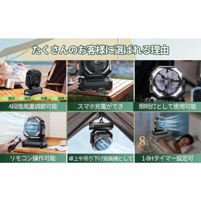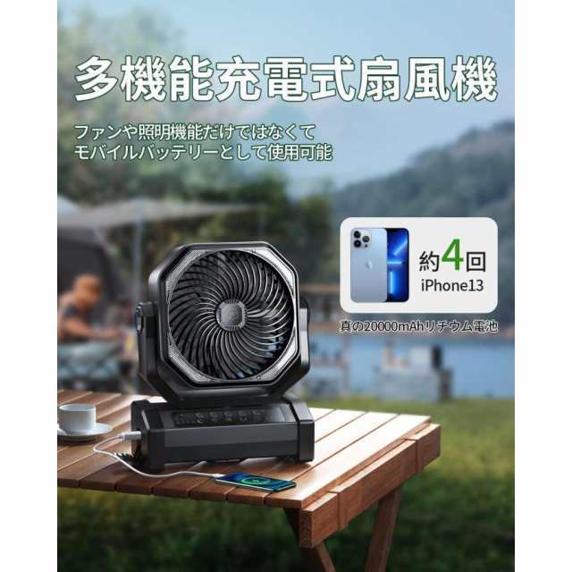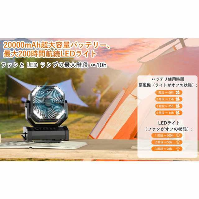【20000mAh大容量】キャンプ 扇風機は20000mAhの超大容量リチウムイオンポリマー電池を内蔵しています。フル充電の場合、扇風機で最大60時間、LEDライトで最大200時間の航続が可能です。