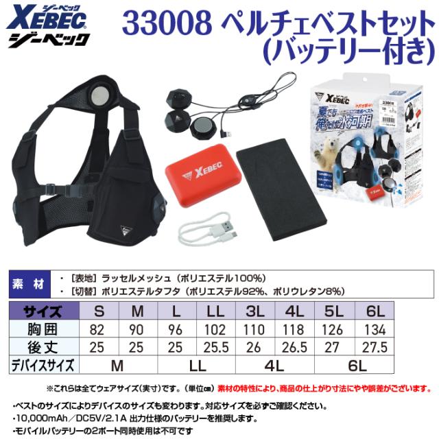 ペルチェ対応ウェア ジーベック XEBEC 作業服 春夏 33008 ペルチェベストセット(バッテリー付き) 4L-6L 作業着