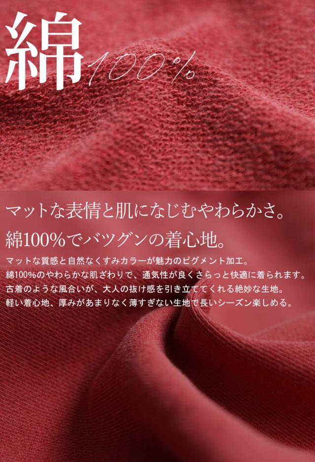 無地のシンプルなデザインに加え、切りっぱなし風の縫製や独特の色落ちが古着風の風合いをプラス。