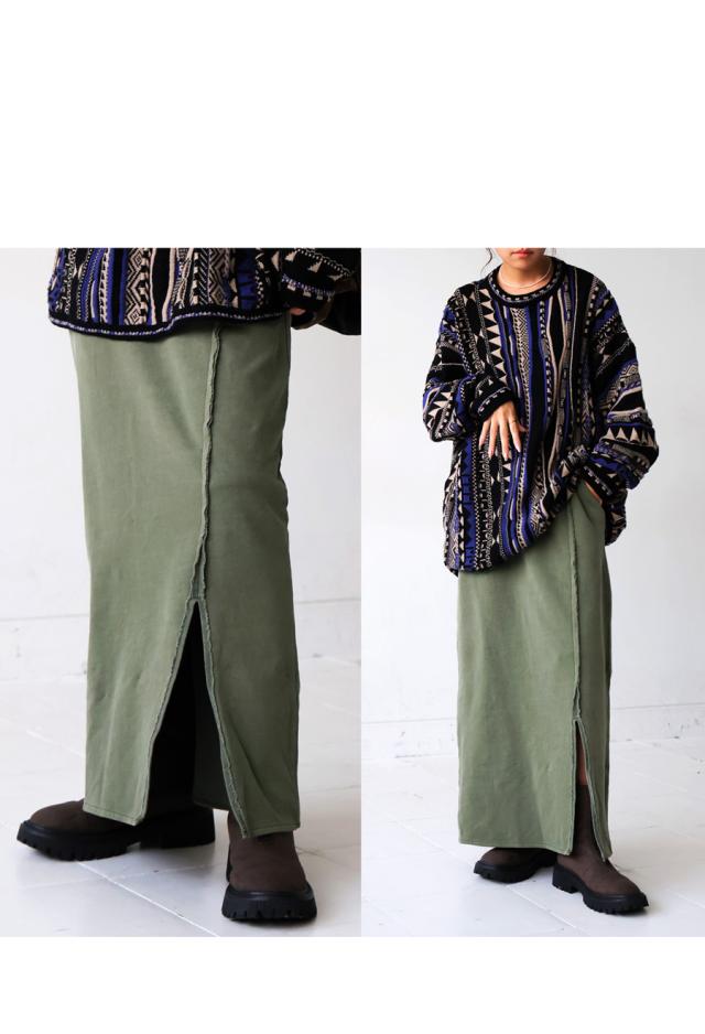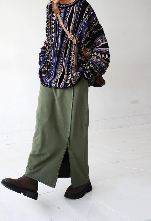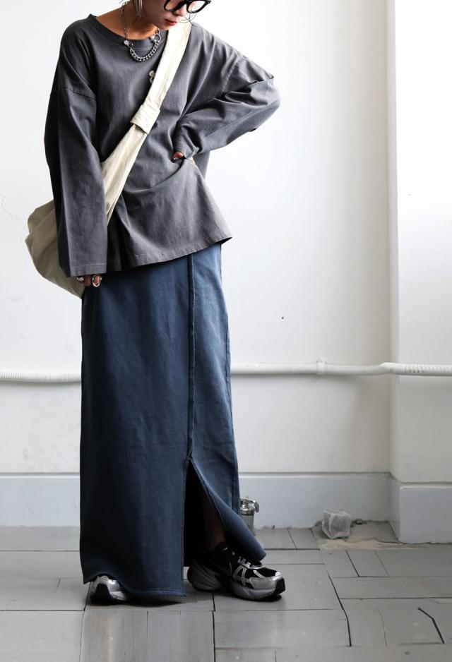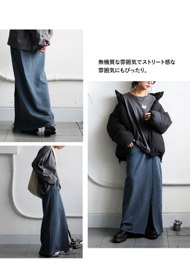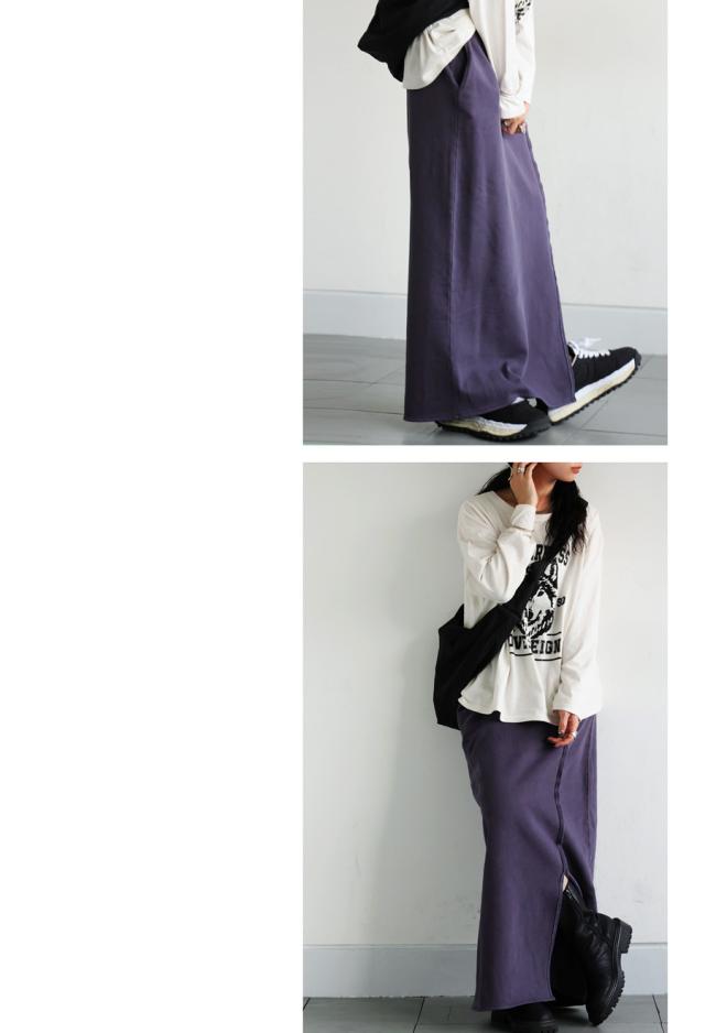 ヴィンテージ風のピグメント加工が魅力のスウェットスカートは、こなれた雰囲気で普段着にも映える万能ロングスカートです。