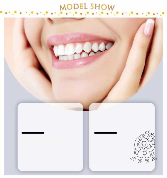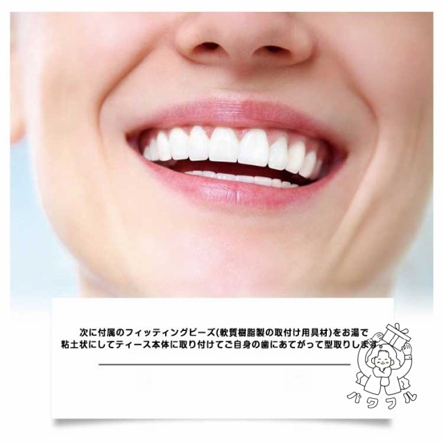 | 上顎と下顎の両方に対応した入れ歯がセットになっております。 脱着はワンタッチで行えますのでいつでもどこでも気軽に使用出来ます。 本体をお湯で柔らかくしてご自身の前歯のカーブに合わせてフィッティング後、冷え固めます。 次に付属のフィッティングビーズ(軟質樹脂製の取付け用具材)をお湯で粘土状にしてティース本体に取り付けてご自身の歯にあてがって型取りします。 ゆっくりと外して冷え固まればご使用開始となります。フィッティングはリセット可能ですのでやり直しが出来ます。 長期間使用しても変色しにくいシリコン素材を使用しており、見た目が自然で清潔感を保ちます。 面接に、デートに、旅行に! インスタントスマイルはあなたに自信と笑顔を提供いたします。 | |