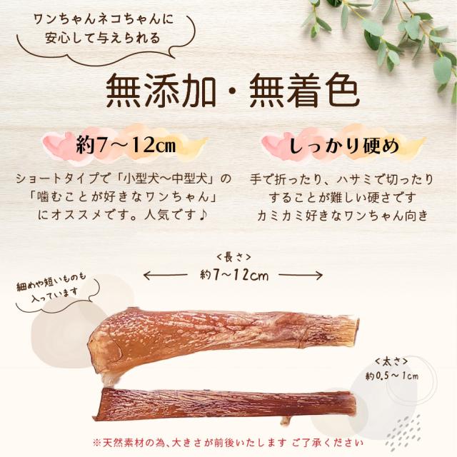 無添加、無着色で低温乾燥(30℃)でじっくり3日間乾燥し、旨味、風味を閉じ込めました。 開封後は冷暗所に保管しお早めに与えてください。 与えすぎない様に注意してください。丸飲みの恐れがあります。 与えている時は飼い主さまの見ている所で与えてください。 <安心・安全へのこだわり> 薬品を使用せず手作業で毛を除去しております。 入念に確認をしておりますが、取り切れず毛が付着していることがございます。 何卒ご了承くださいませ。 |