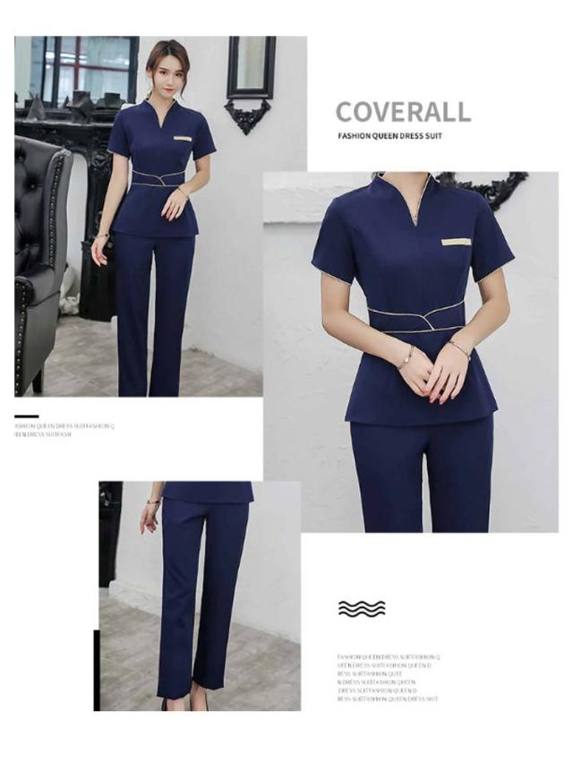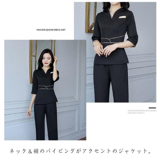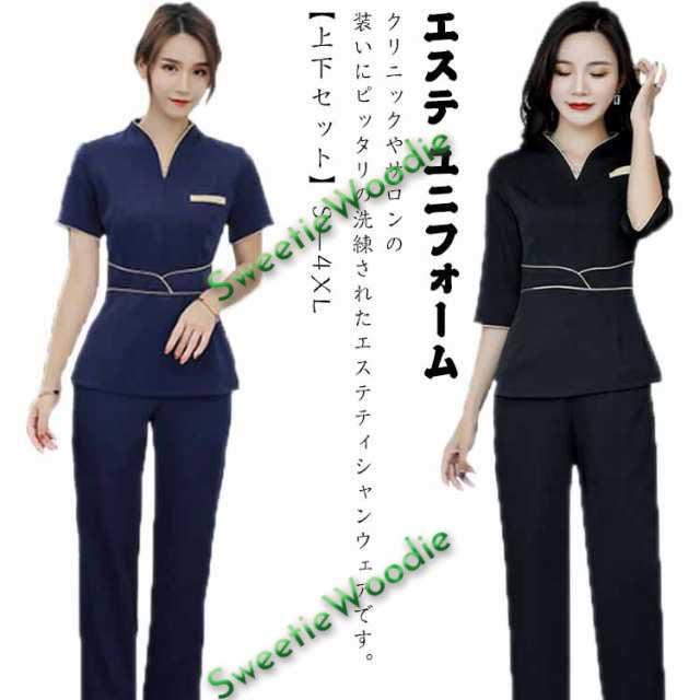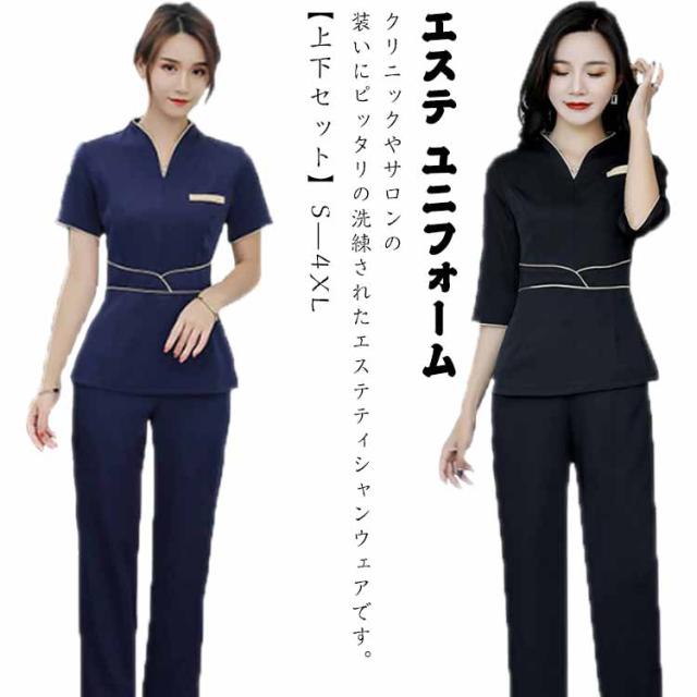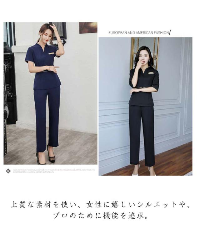 エステ ユニフォーム 半袖 ジャケット ストレッチ パンツ 上下セット エステ サロン 美容 歯科 クリニック 受付 制服 セットアップ レディース 女性用 作業着 2点セット エステティシャンウエア おしゃれ ネイビー 紺 ブラック 黒